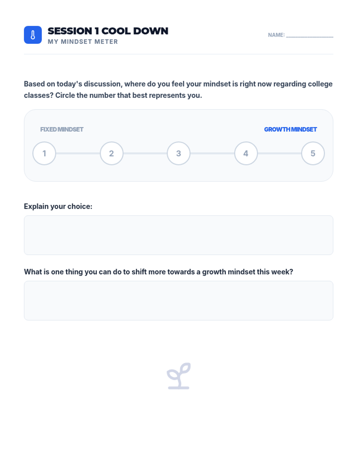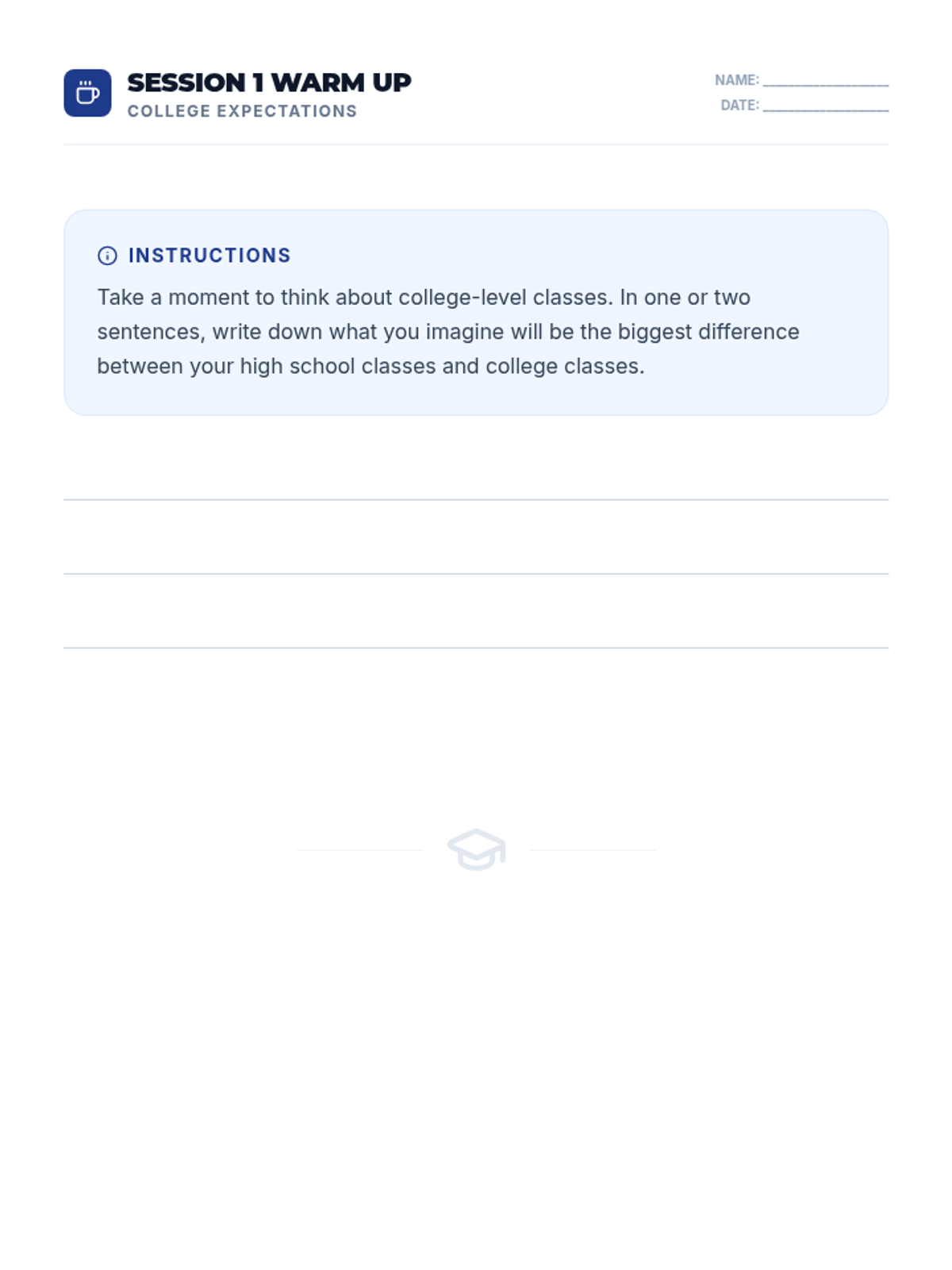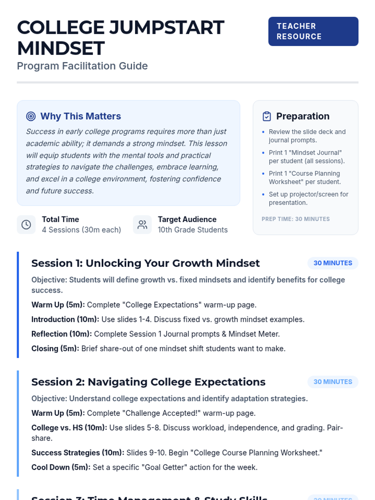 A 4-session program designed to help 10th-grade students transition to college-level coursework by developing a growth mindset, time management skills, and self-advocacy strategies.