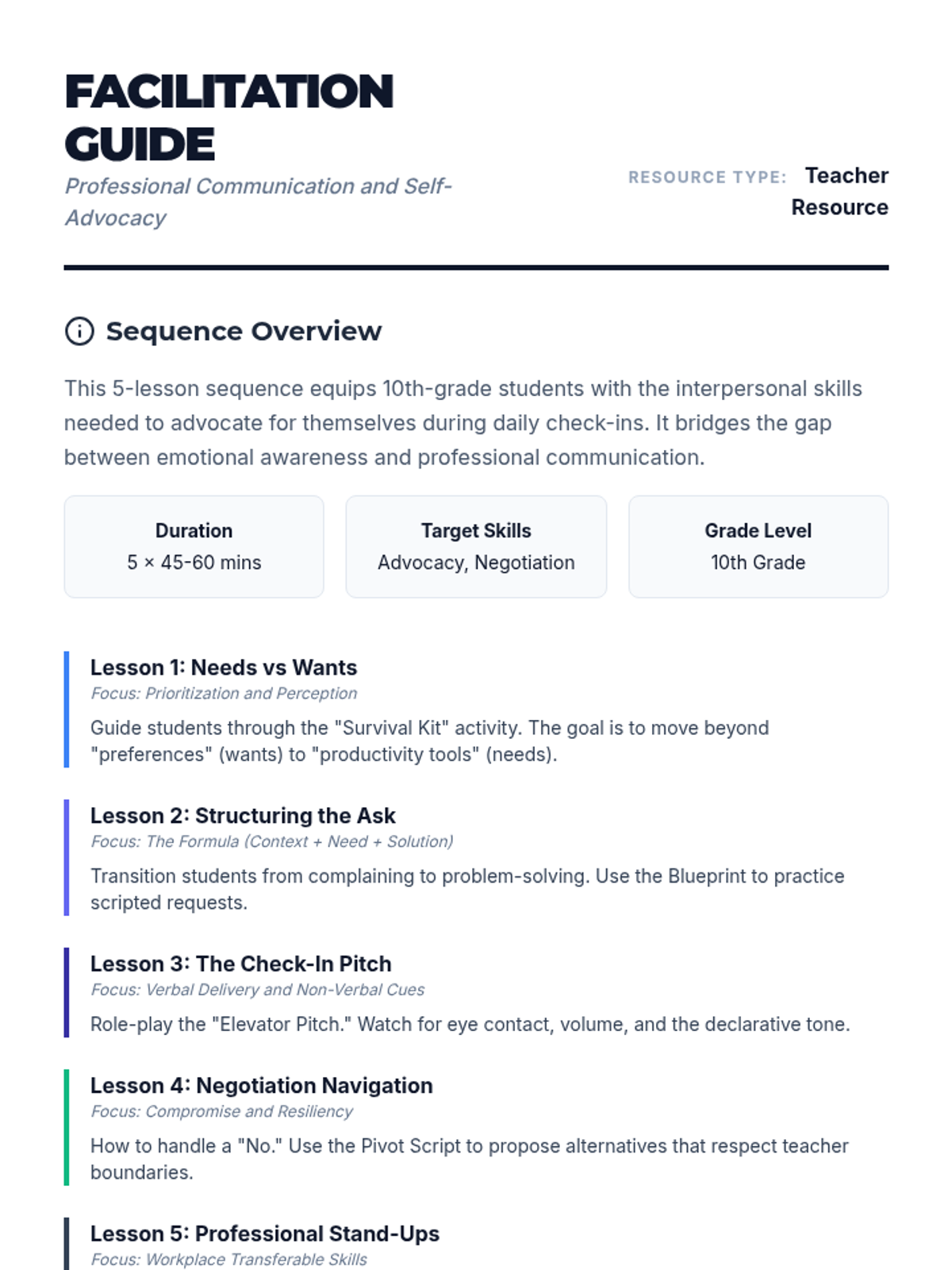 A sequence for 10th-grade students focusing on the interpersonal aspects of check-ins: communicating needs effectively to authority figures. Students learn to distinguish needs from wants, script professional requests, and role-play self-advocacy in school and workplace contexts.