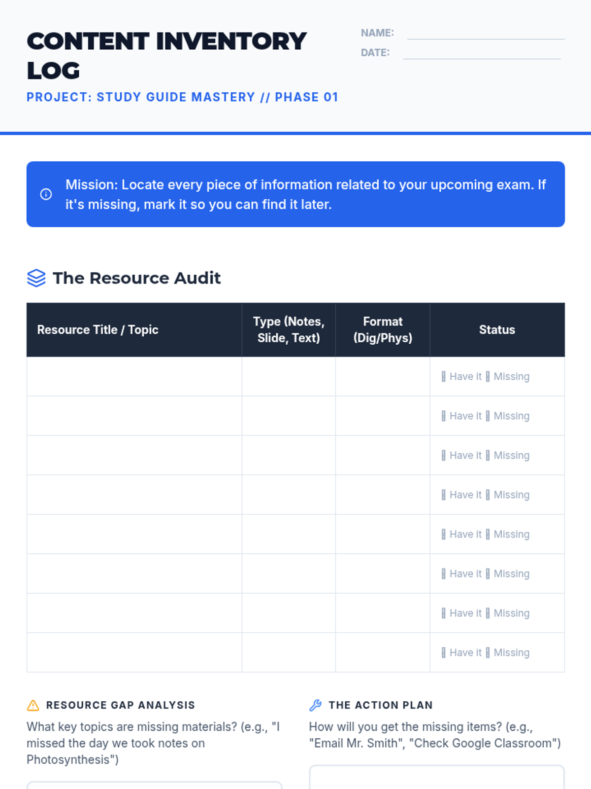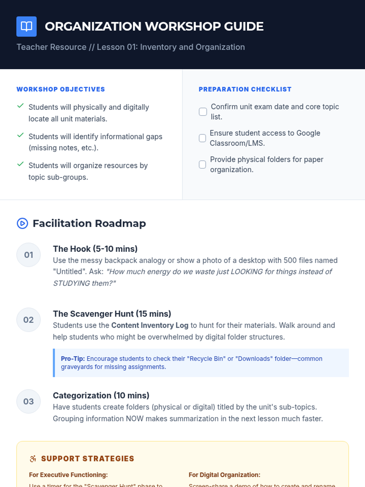 This sequence teaches 10th-grade students in academic support settings how to synthesize course materials into accessible, high-quality study guides. Students learn to inventory resources, extract essential concepts using the '10% rule', format for cognitive accessibility, and predict assessment questions to master their content.