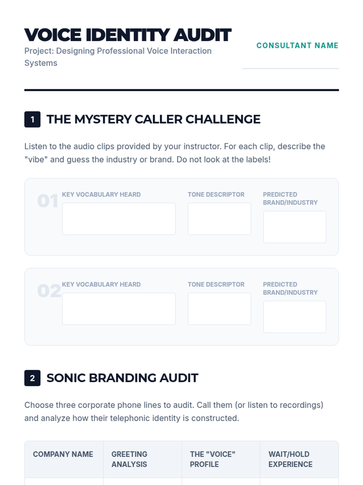 Students step into the role of corporate communication architects to design audio brand identities, professional voicemail systems, and efficient call flow structures. This sequence bridges technical writing, user experience (UX) design, and professional speaking through a project-based approach.