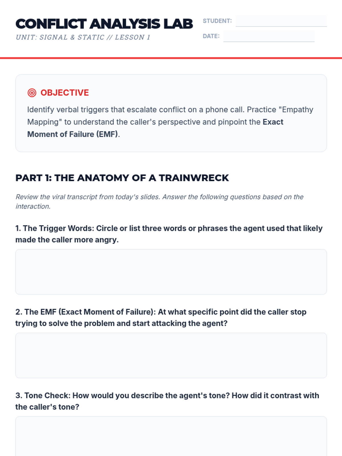 An advanced sequence focused on mastering professional phone communication through conflict resolution and de-escalation techniques for 10th-grade students. Students progress from identifying triggers to managing high-stakes simulations.