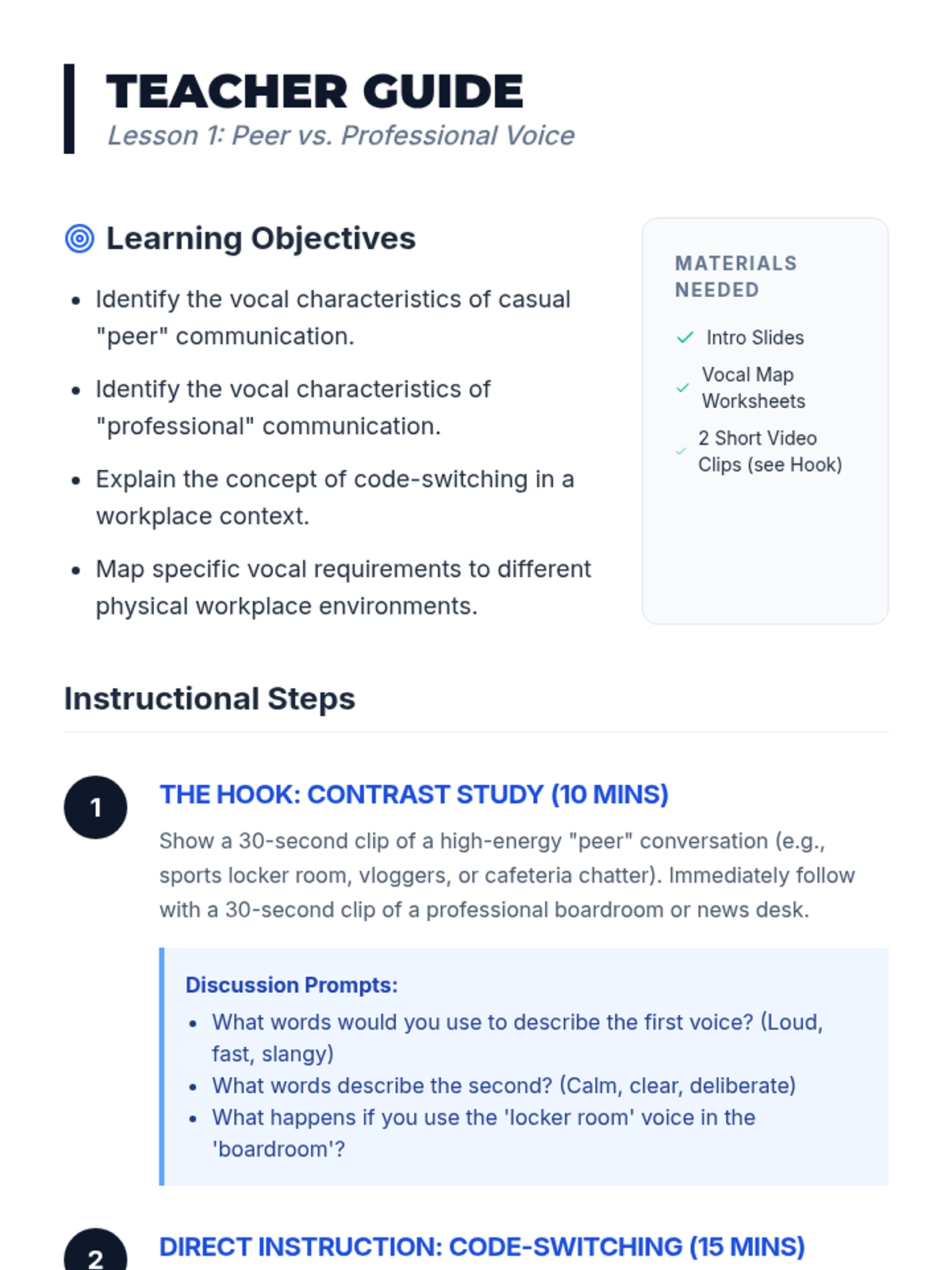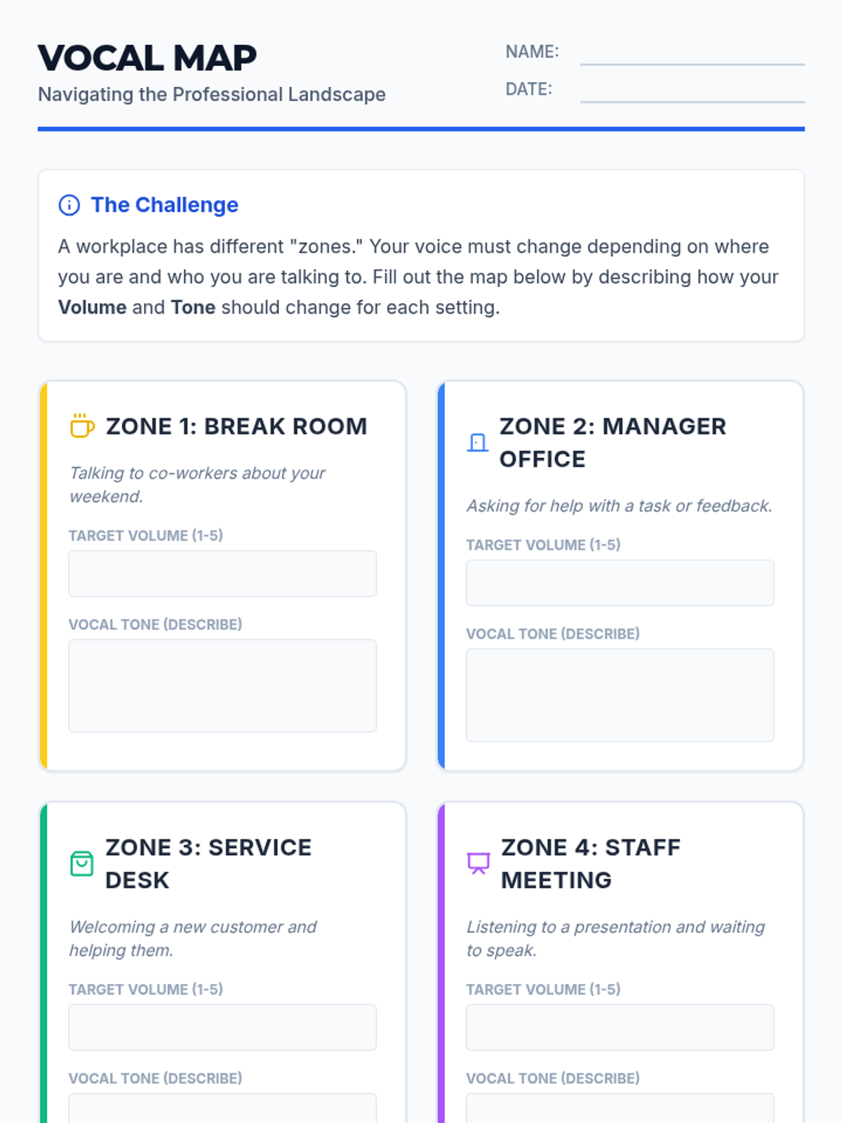 This sequence focuses on the critical transition skill of code-switching vocal patterns for professional environments. Students analyze and practice volume, tone, and pacing requirements across various workplace scenarios to build a repertoire of 'professional voices.'