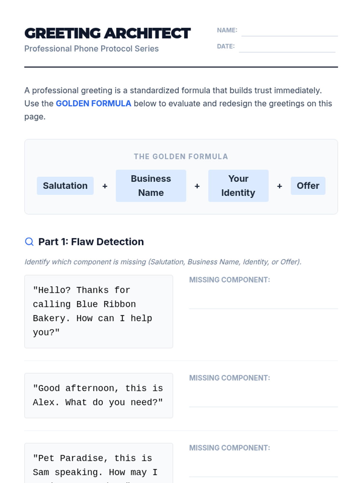 A case-study driven sequence where students act as communication consultants to evaluate and improve business phone protocols, focusing on brand identity, privacy, and etiquette.