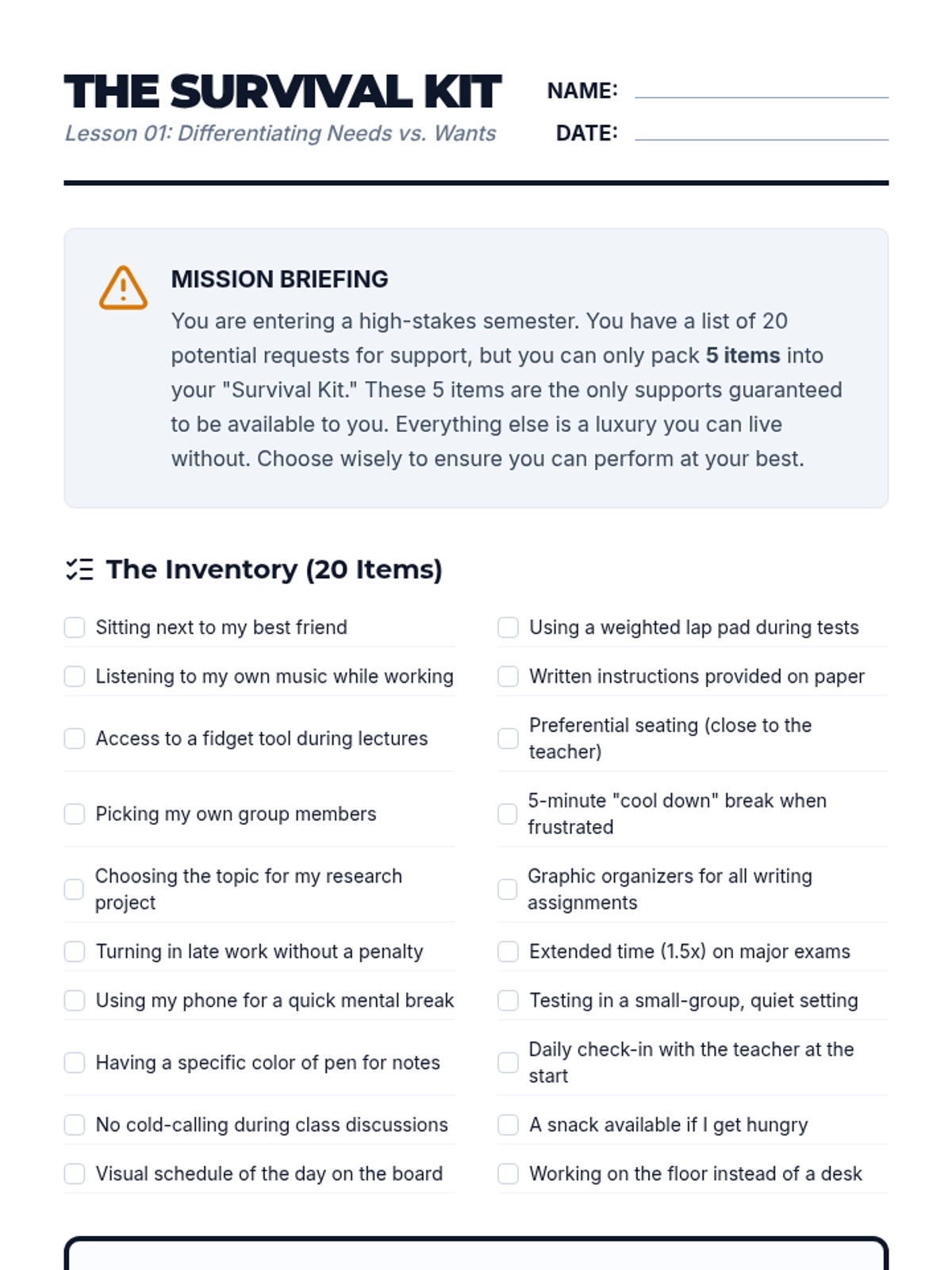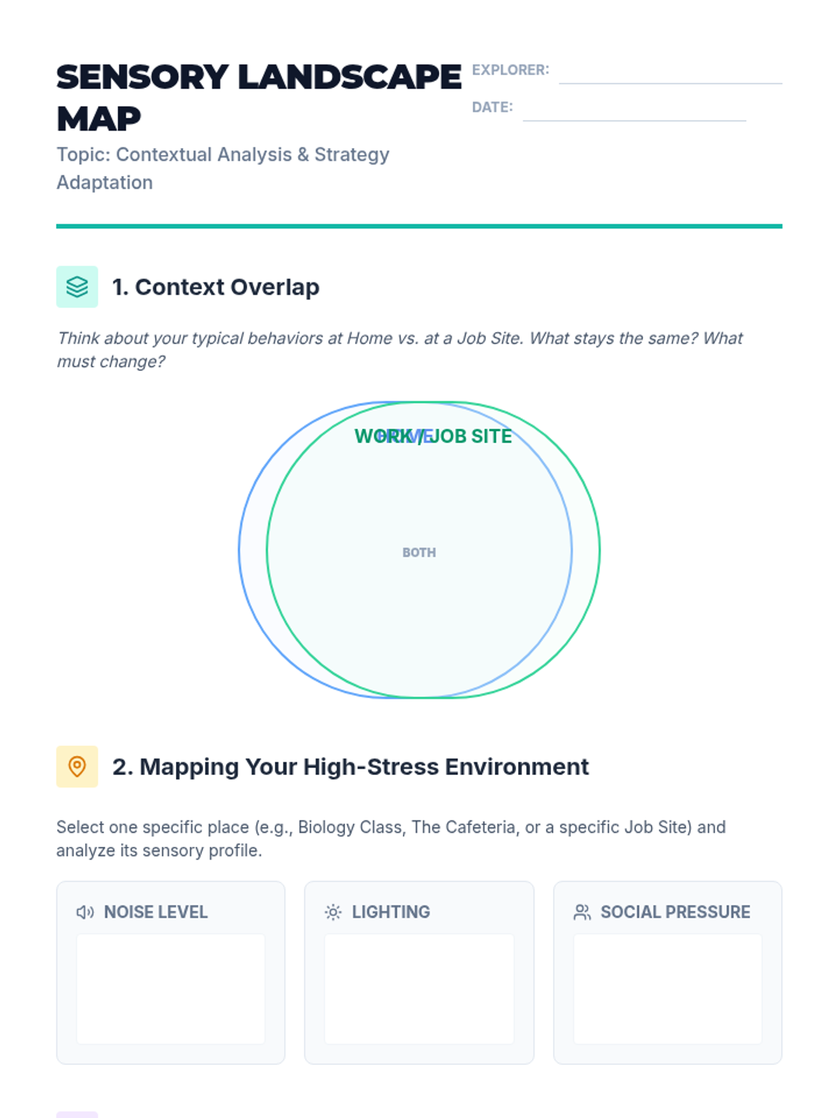 A 10th-grade sequence focused on transitioning sensory regulation strategies from private spaces to public, academic, and vocational environments. Students learn to analyze sensory landscapes, understand their legal rights, and develop professional self-advocacy skills.