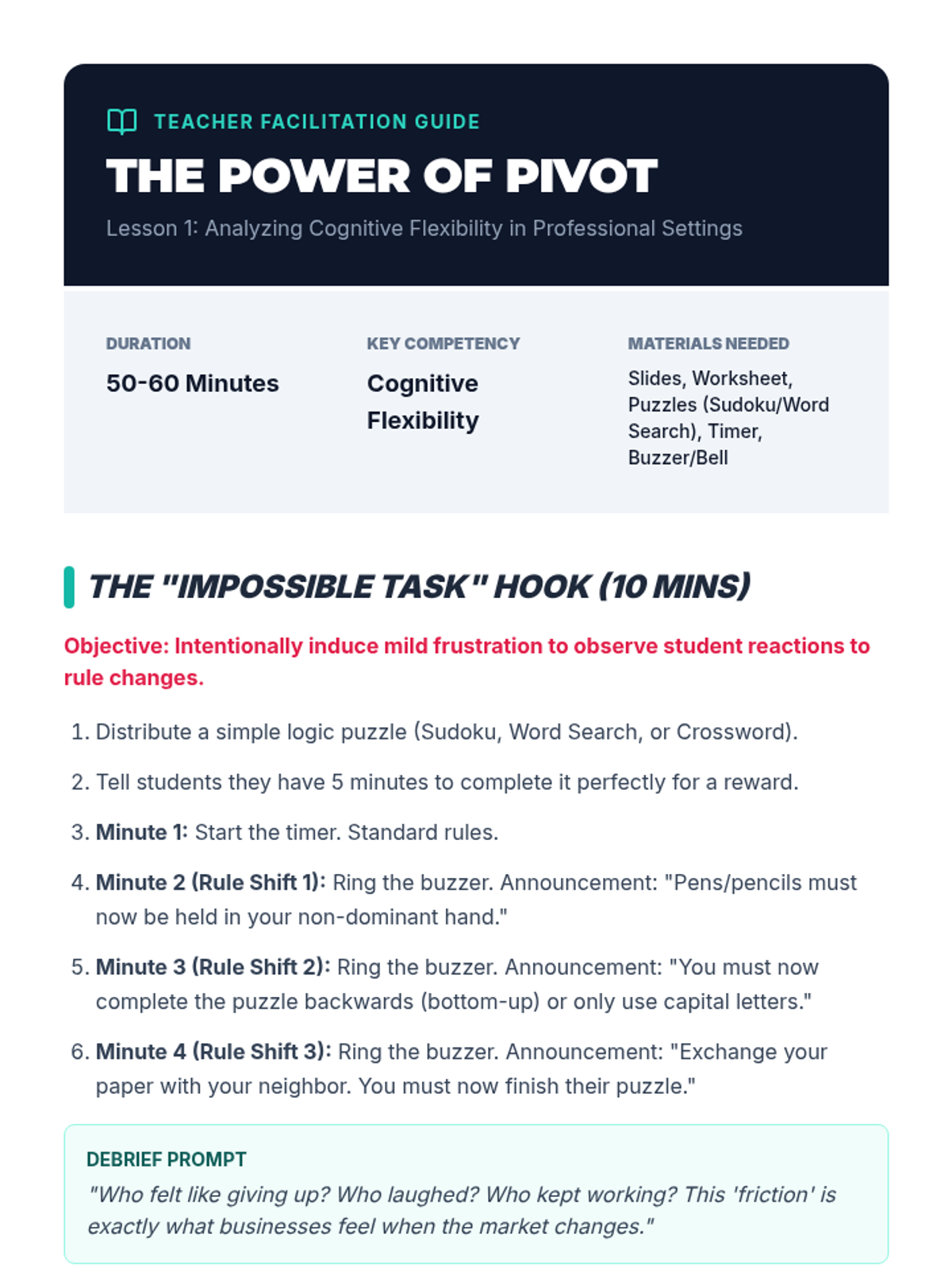 A comprehensive 5-lesson unit for 10th graders focusing on cognitive flexibility, professional code-switching, crisis management, and emotional resilience in the workplace. Students engage in simulations and case studies to develop a toolkit for navigating professional uncertainty.