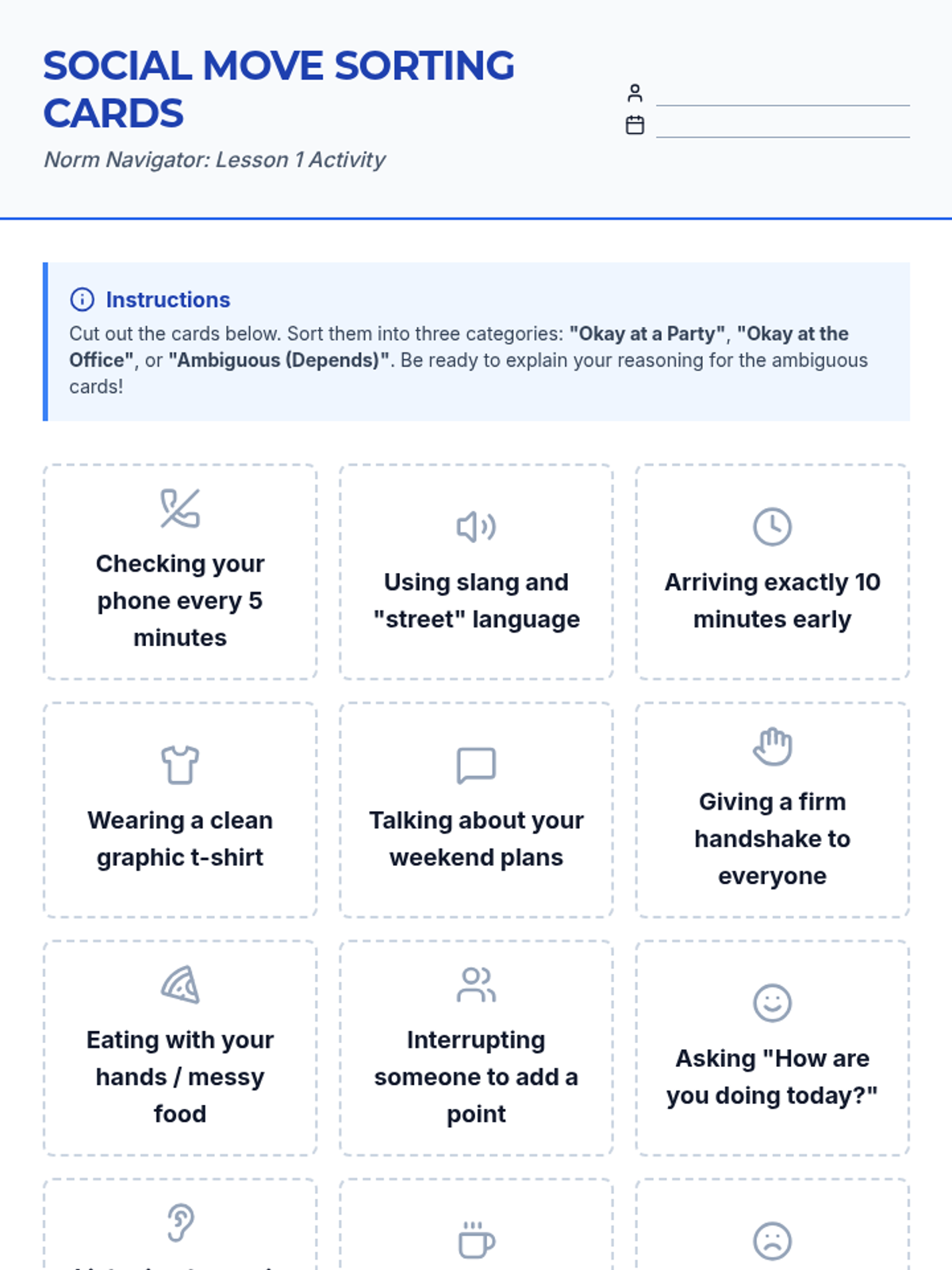 A 5-lesson unit designed for 10th-grade students to master social decision-making in professional environments. Students learn to distinguish workplace norms, navigate hierarchy, process feedback, interpret non-verbal cues, and make strategic decisions in high-stakes social scenarios.