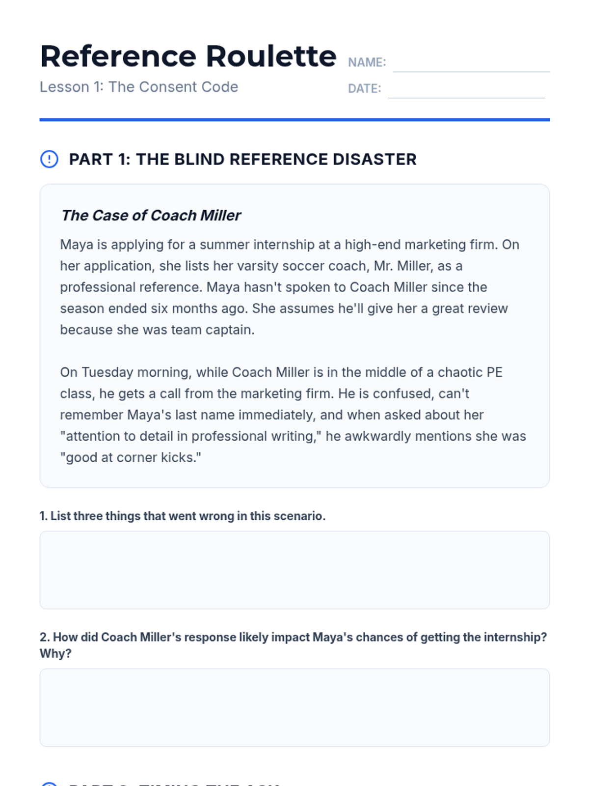 This sequence teaches 10th-grade students the essential interpersonal and professional communication skills required to secure and maintain professional references. Students will move from understanding the importance of consent to drafting emails, practicing verbal requests, and providing references with the necessary tools to advocate for them effectively.