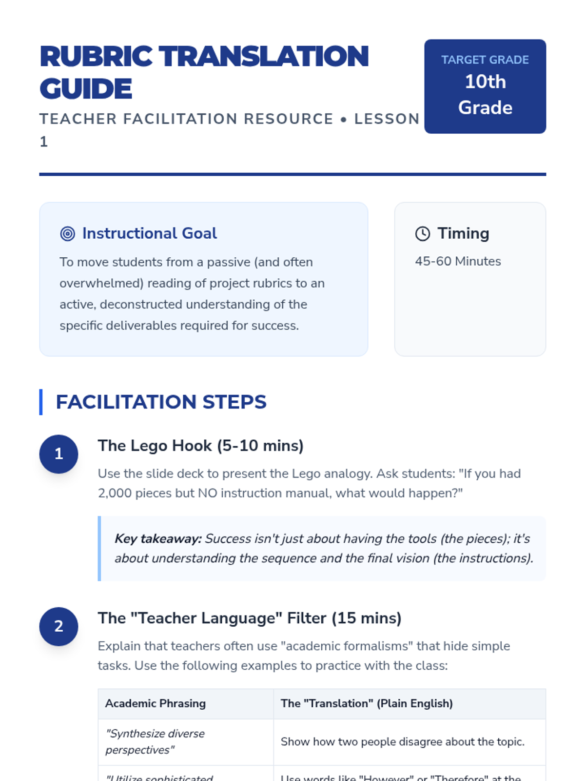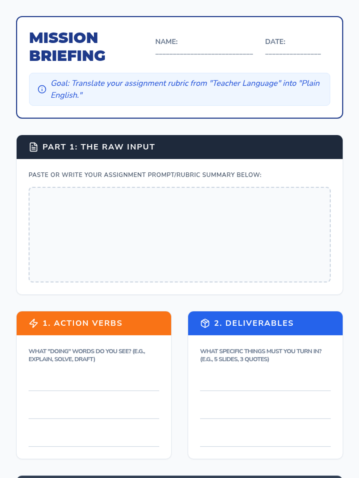 This sequence teaches students to deconstruct complex academic assignments by identifying hidden requirements, expanding tasks into manageable actions, and using backwards planning to create realistic timelines for completion.