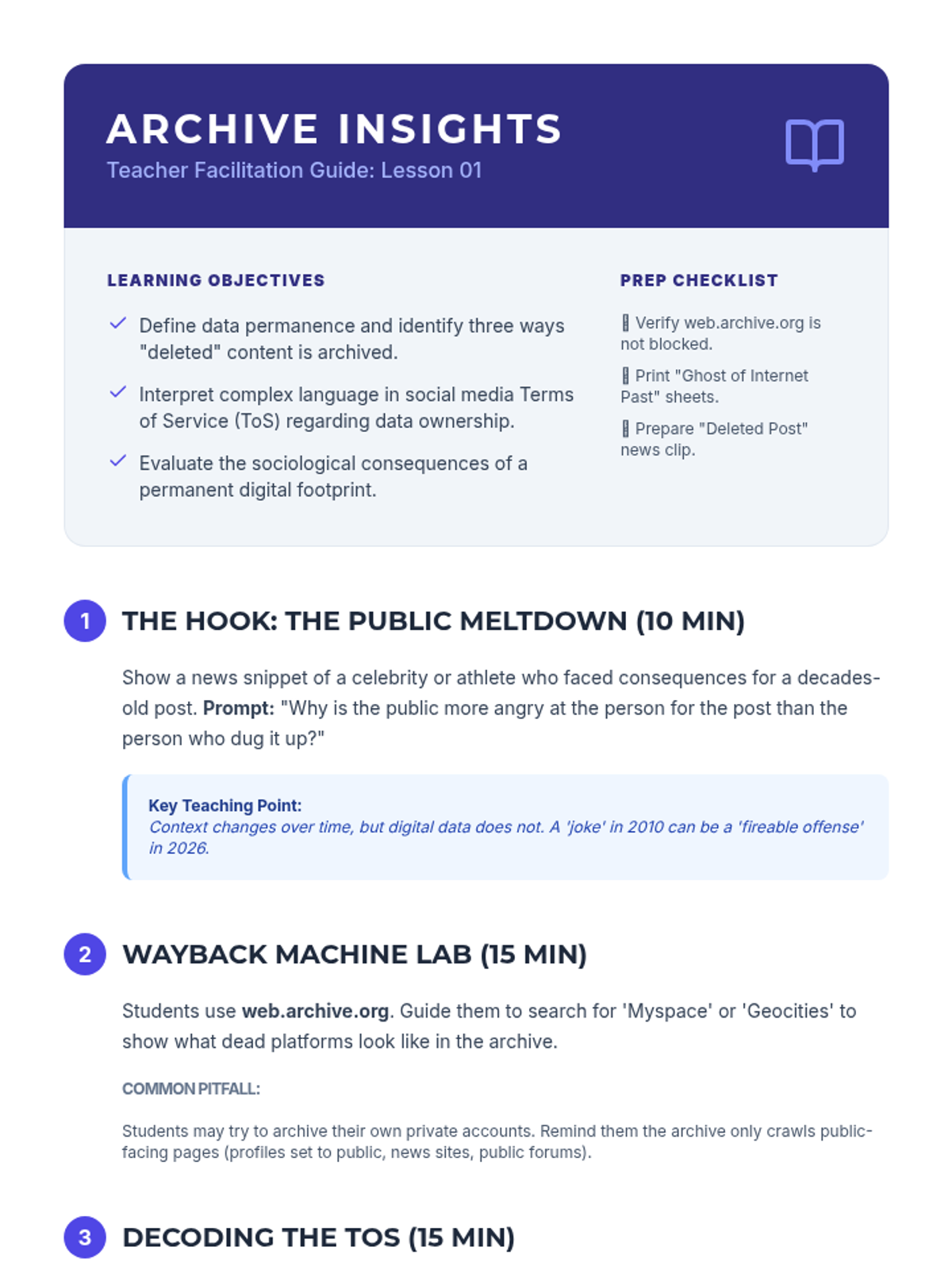 A comprehensive 5-lesson sequence for 10th graders focusing on the long-term implications of digital footprints, data permanence, and proactive reputation management. Students analyze real-world case studies, audit mock social media profiles, and develop a strategic plan for their own positive digital brand.