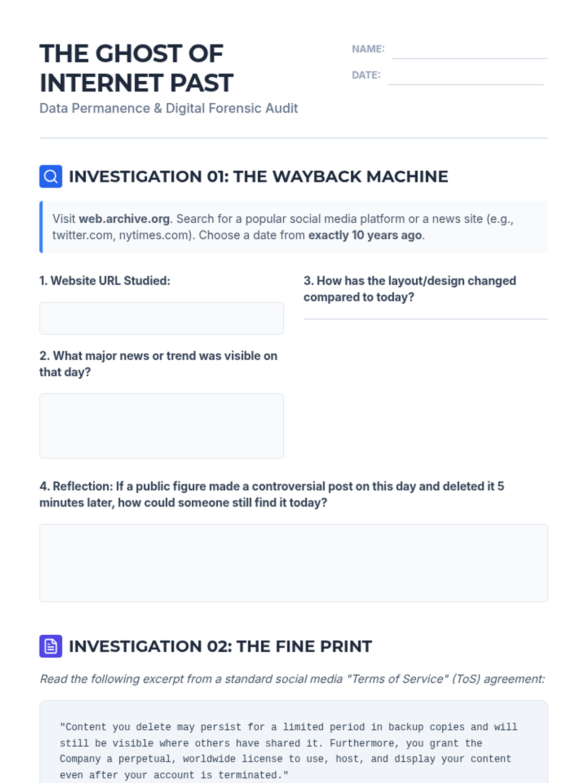 Students explore the intersection of personal data, privacy, and AI-driven tracking. They analyze digital footprints, decode terms of service, debate the ethics of smart devices, and create their own data protection standards.