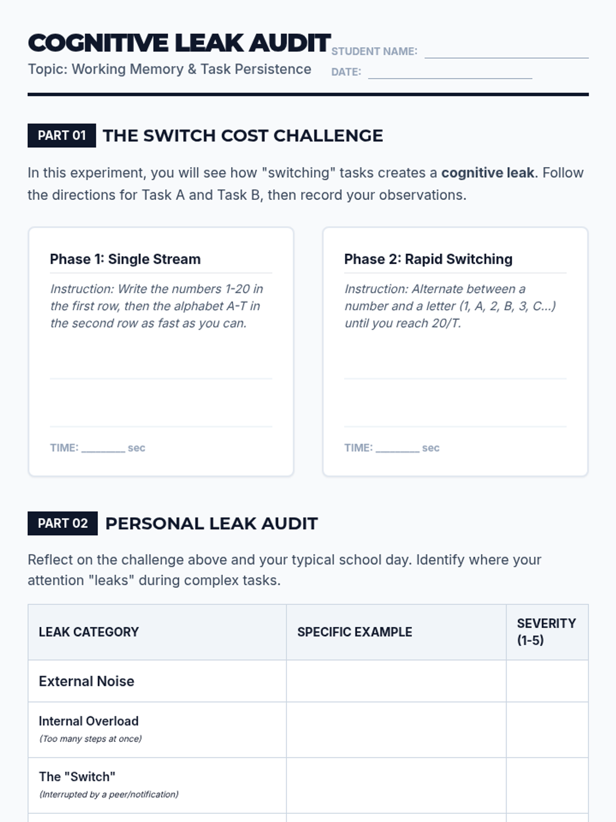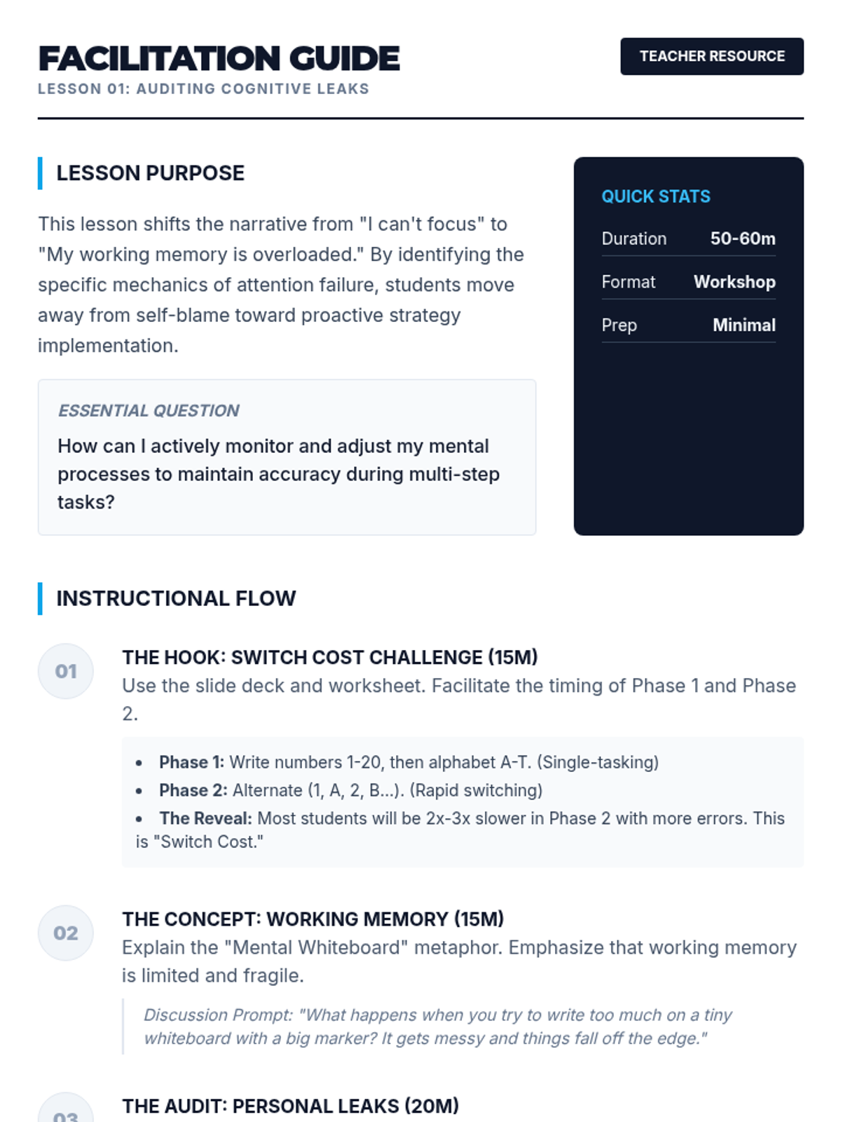 This sequence empowers 10th-grade students to manage cognitive resources by treating attention as a limited currency. Students move from self-diagnosis of working memory gaps to the creation of a personalized 'Focus Protocol' for sustained academic persistence.