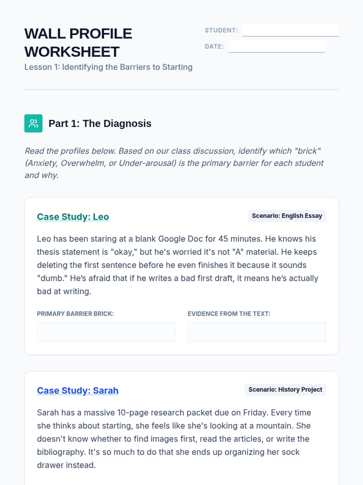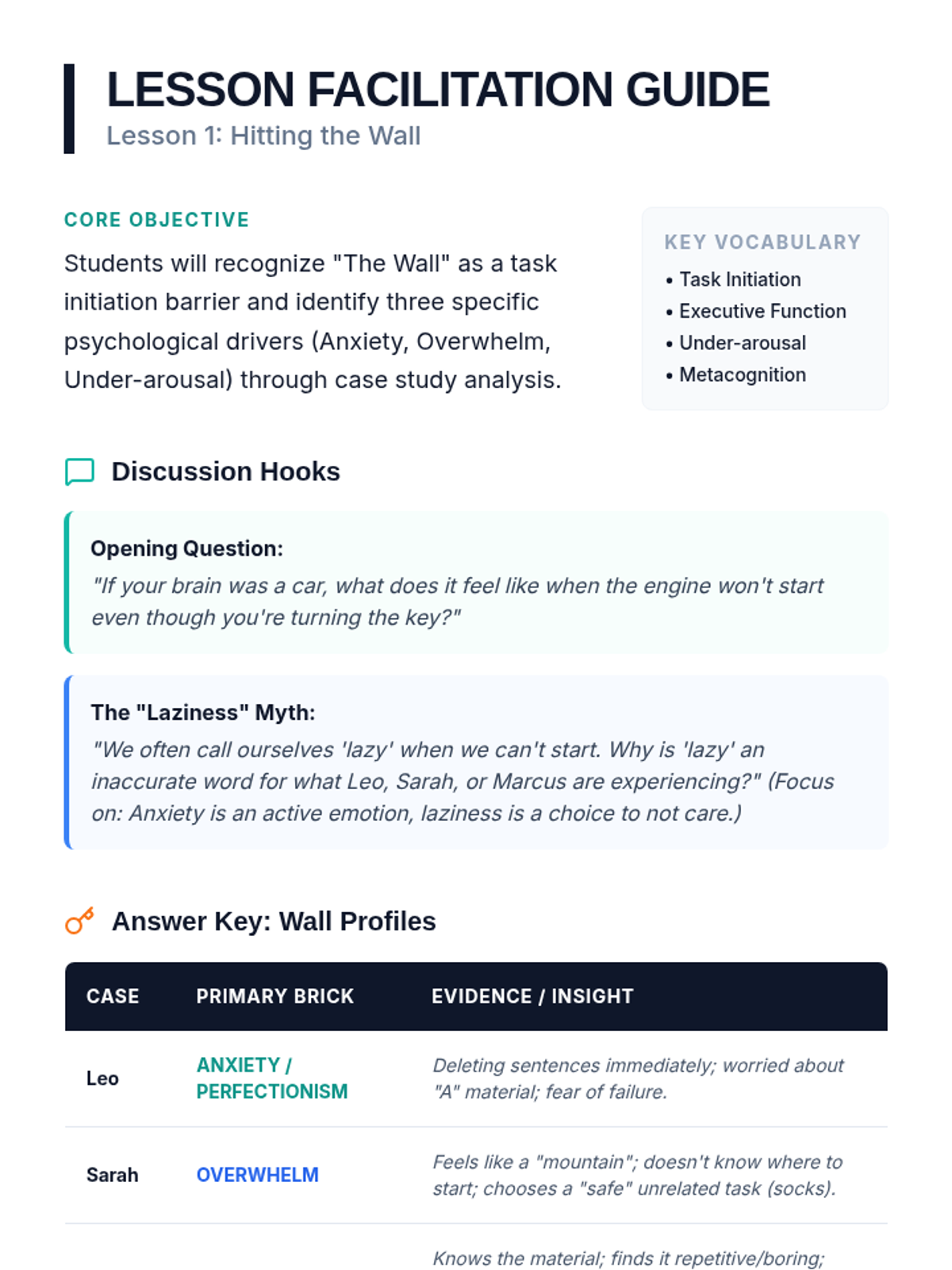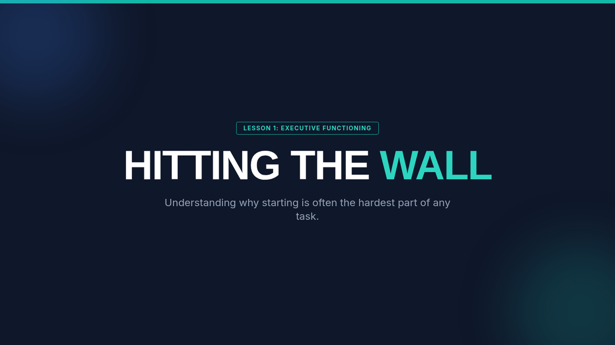 A 5-lesson sequence designed for 10th-grade students to overcome executive function barriers to task initiation. Students learn to identify internal blocks like anxiety and perfectionism, and develop a toolkit of strategies including chunking and the 'sloppy copy' technique to gain momentum and start tasks independently.