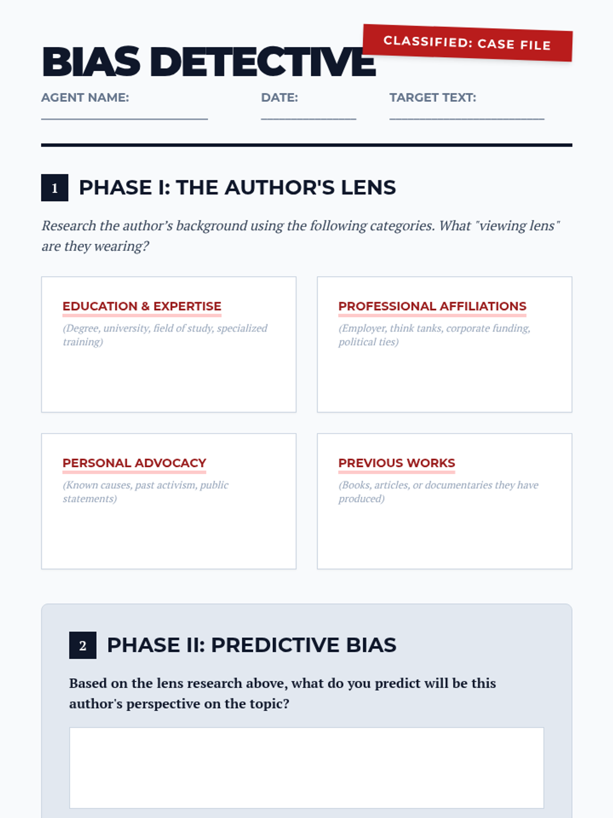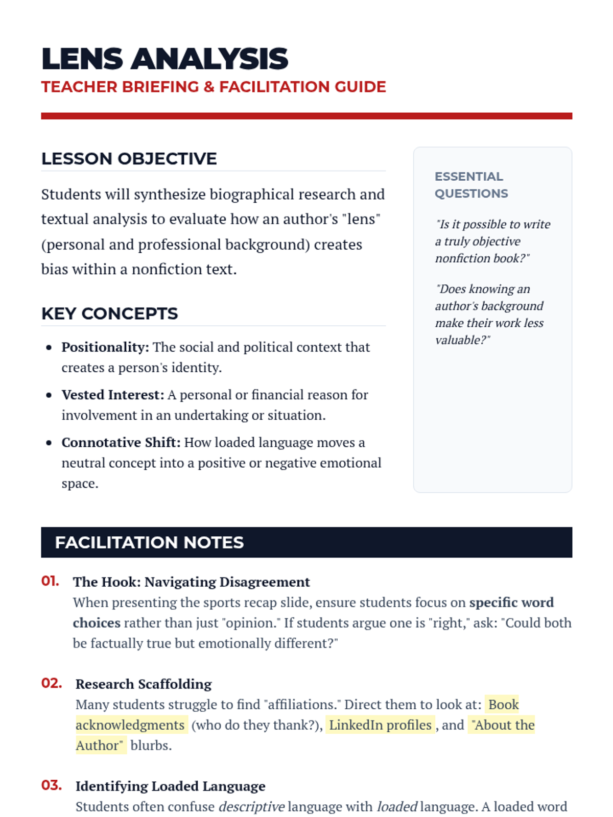 This sequence focuses on information literacy and the evaluation of source validity within the context of a nonfiction book study. Students act as investigative journalists, scrutinizing author credibility, source integration, fact-checking claims, and identifying logical fallacies, culminating in an editorial board simulation.