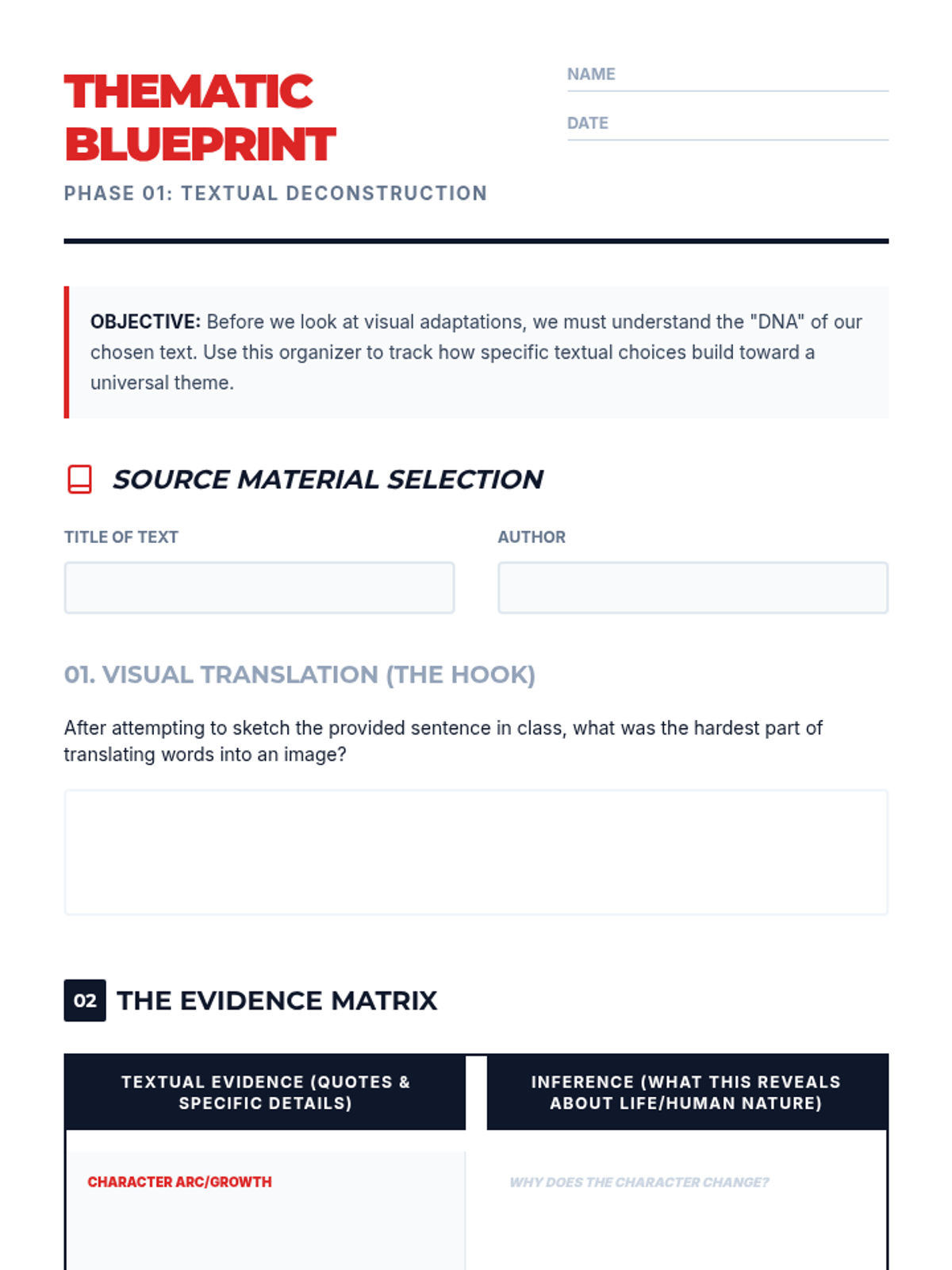 A 10th-grade project-based sequence exploring how medium (text vs. visual) influences the inference and delivery of universal themes. Students move from textual analysis to visual literacy, culminating in a comparative multimedia project.