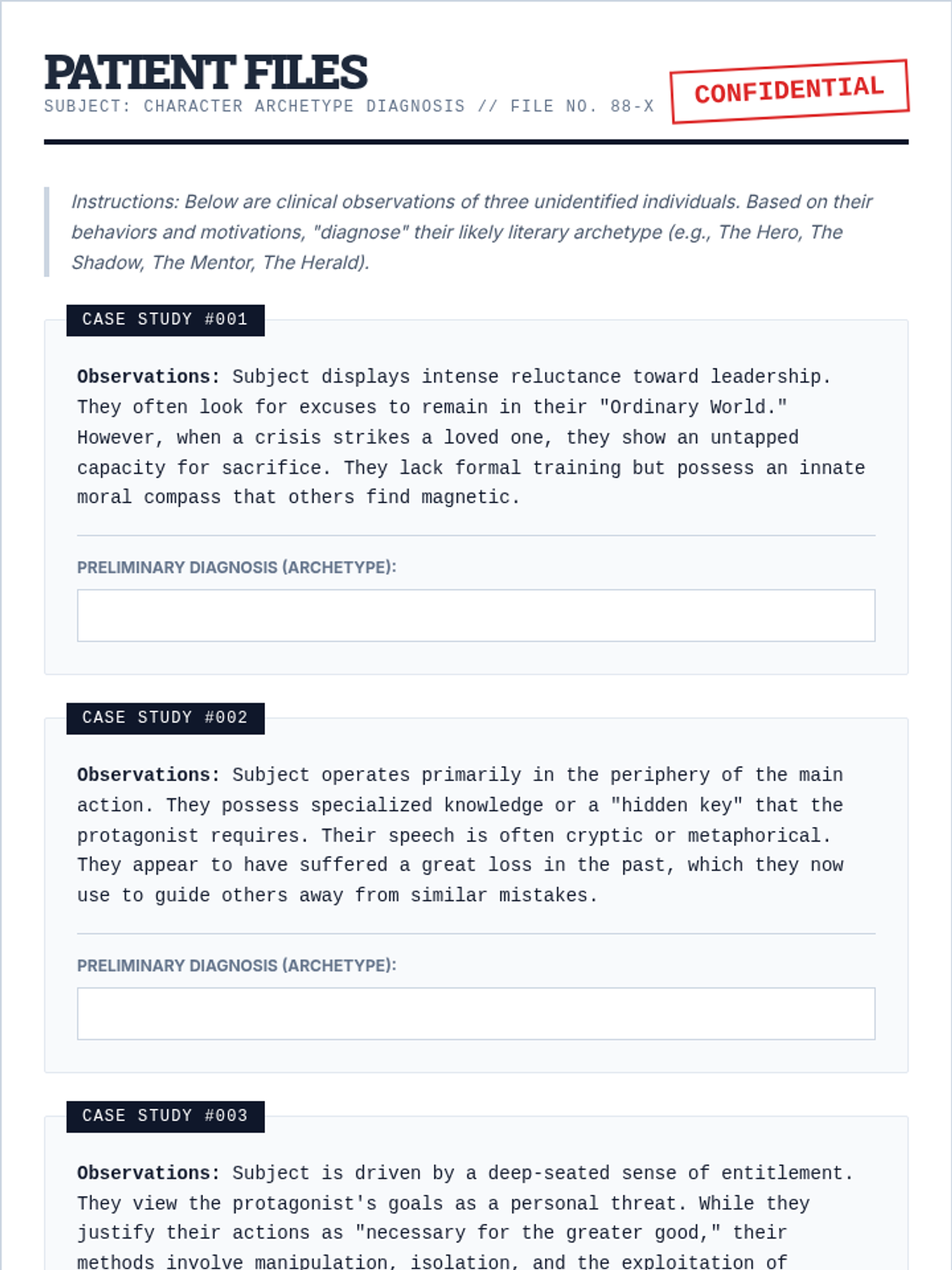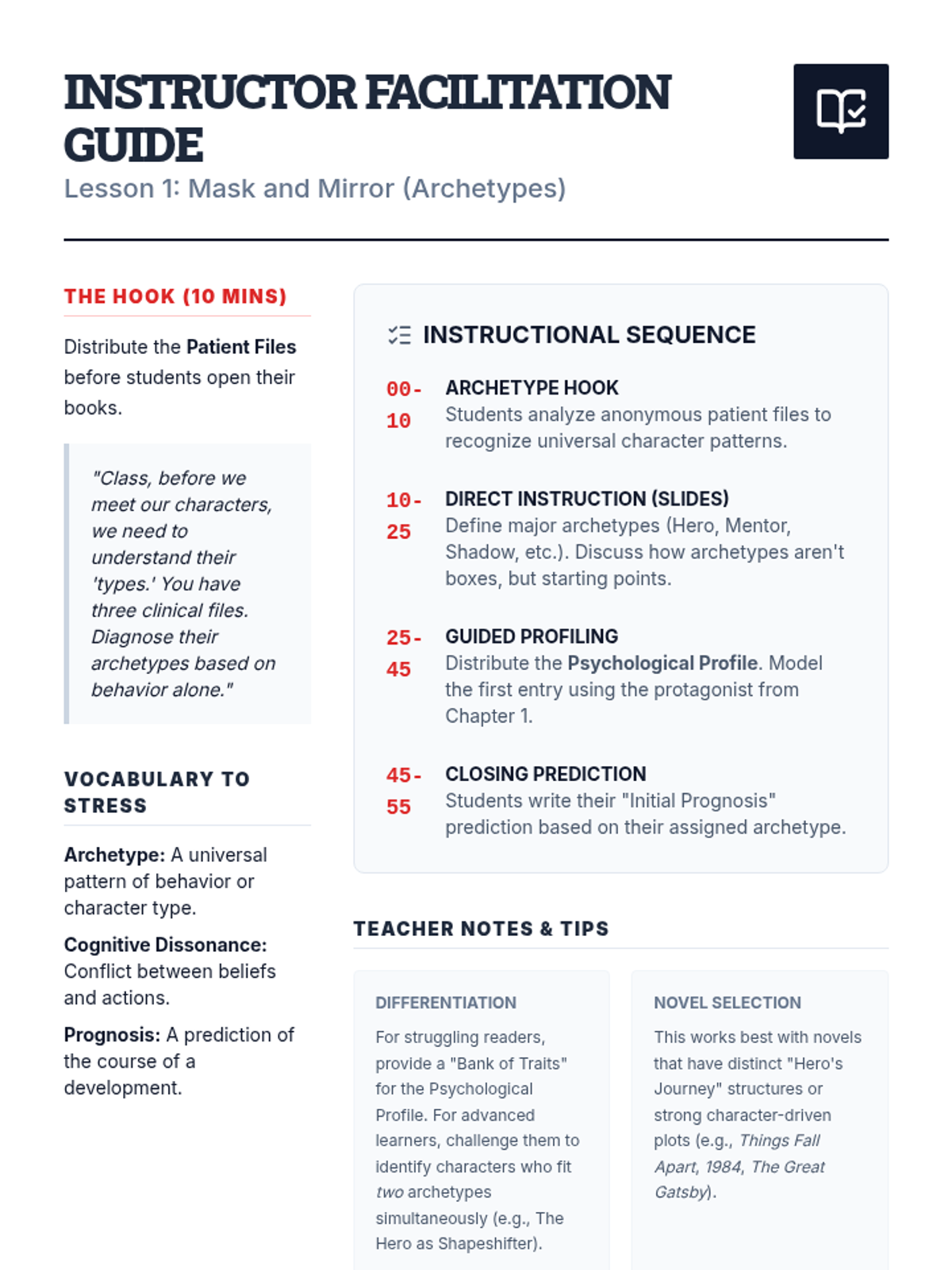 This high-school ELA sequence explores character psychology and archetypes through a clinical, investigative lens. Students analyze internal conflict, antagonist perspectives, and the impact of plot pressure on character development, culminating in a Socratic Seminar on moral agency.