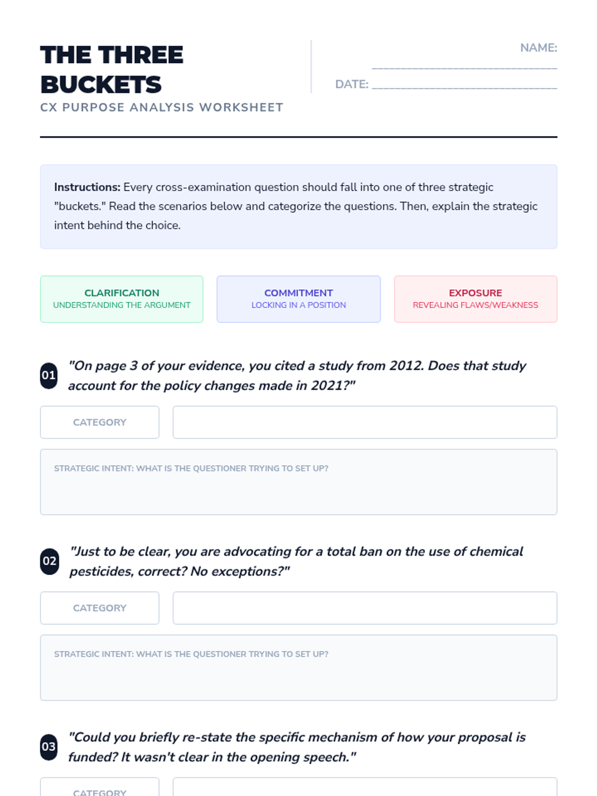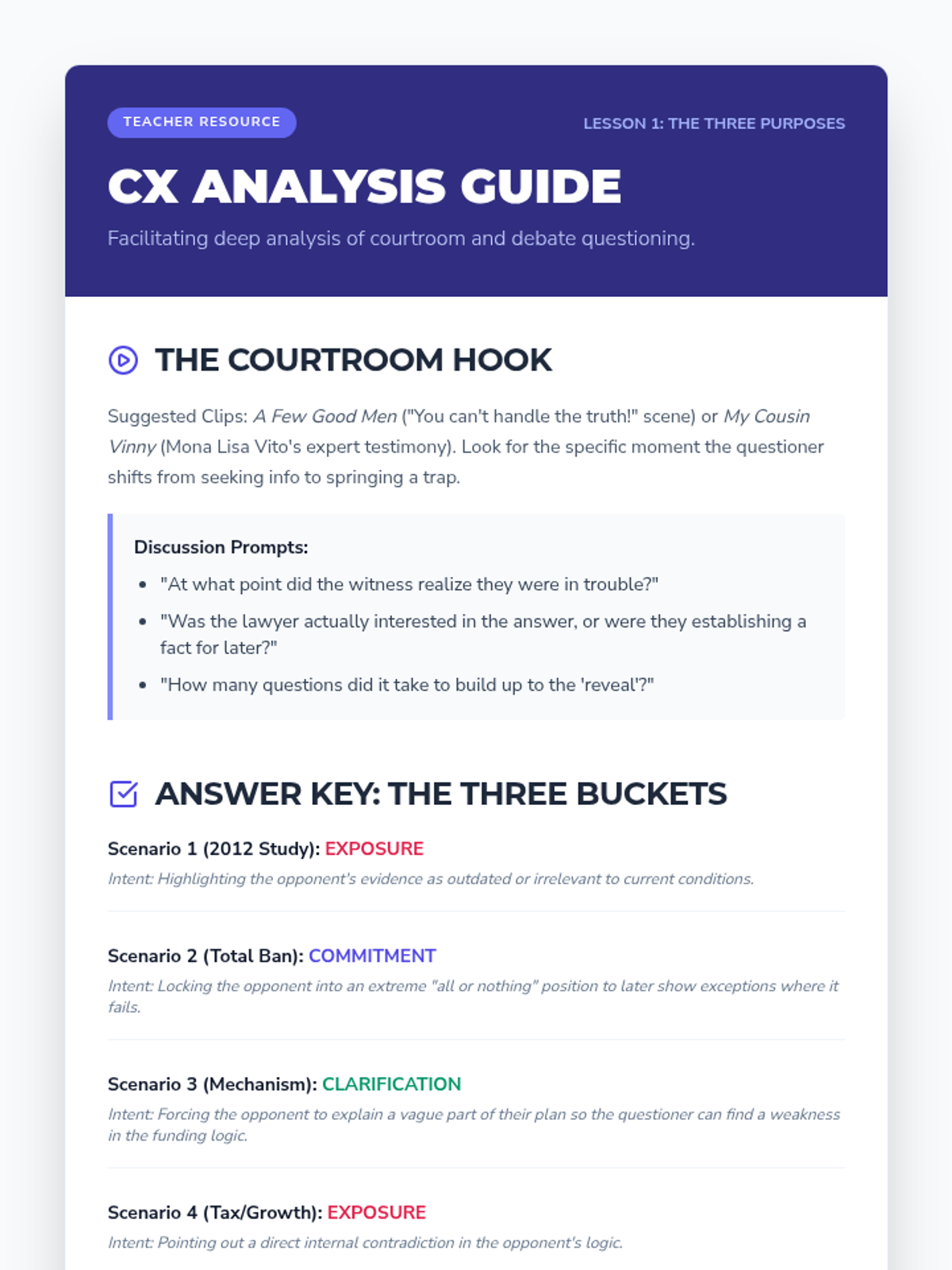 A comprehensive 10th-grade sequence on Cross-Examination (CX) strategy. Students progress from understanding the fundamental purposes of questioning to designing complex logical traps and handling evasive opponents in live simulations.