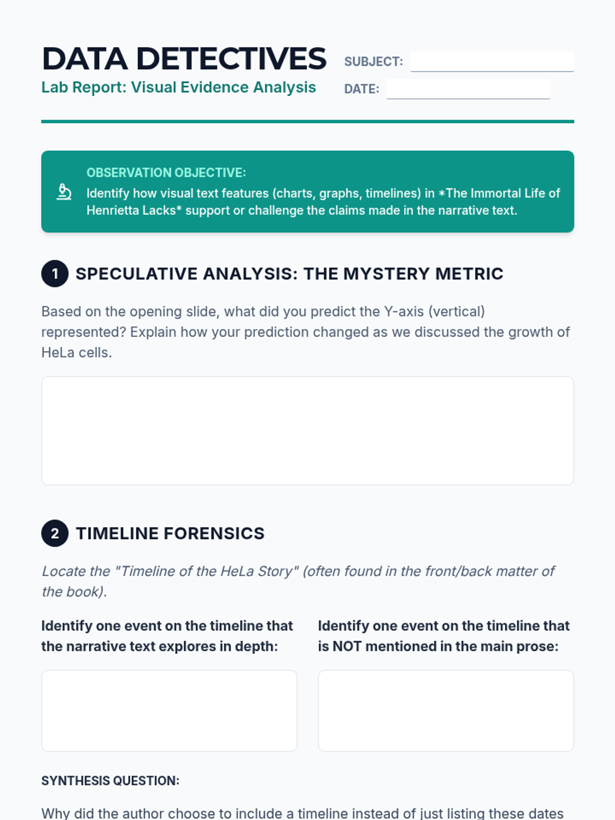 A project-based unit where 10th-grade students synthesize information from a primary nonfiction book with supplementary articles, videos, and data. Using *The Immortal Life of Henrietta Lacks* as a core text, students explore how different mediums treat the same complex subject to build a comprehensive understanding.
