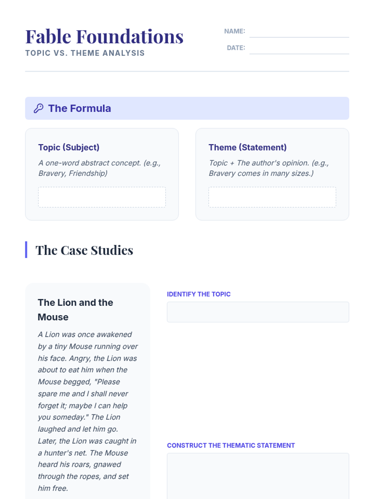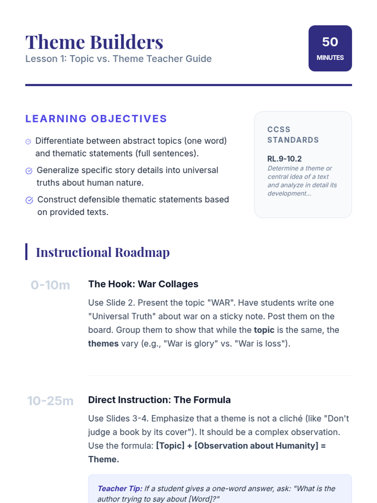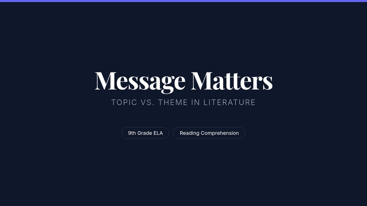 This 9th-grade ELA sequence guides students through the shift from basic plot comprehension to abstract thematic analysis. Students will learn to distinguish topics from themes, track motifs, analyze the impact of narrative resolutions, and construct nuanced thematic statements through collaborative debate and Socratic seminars.