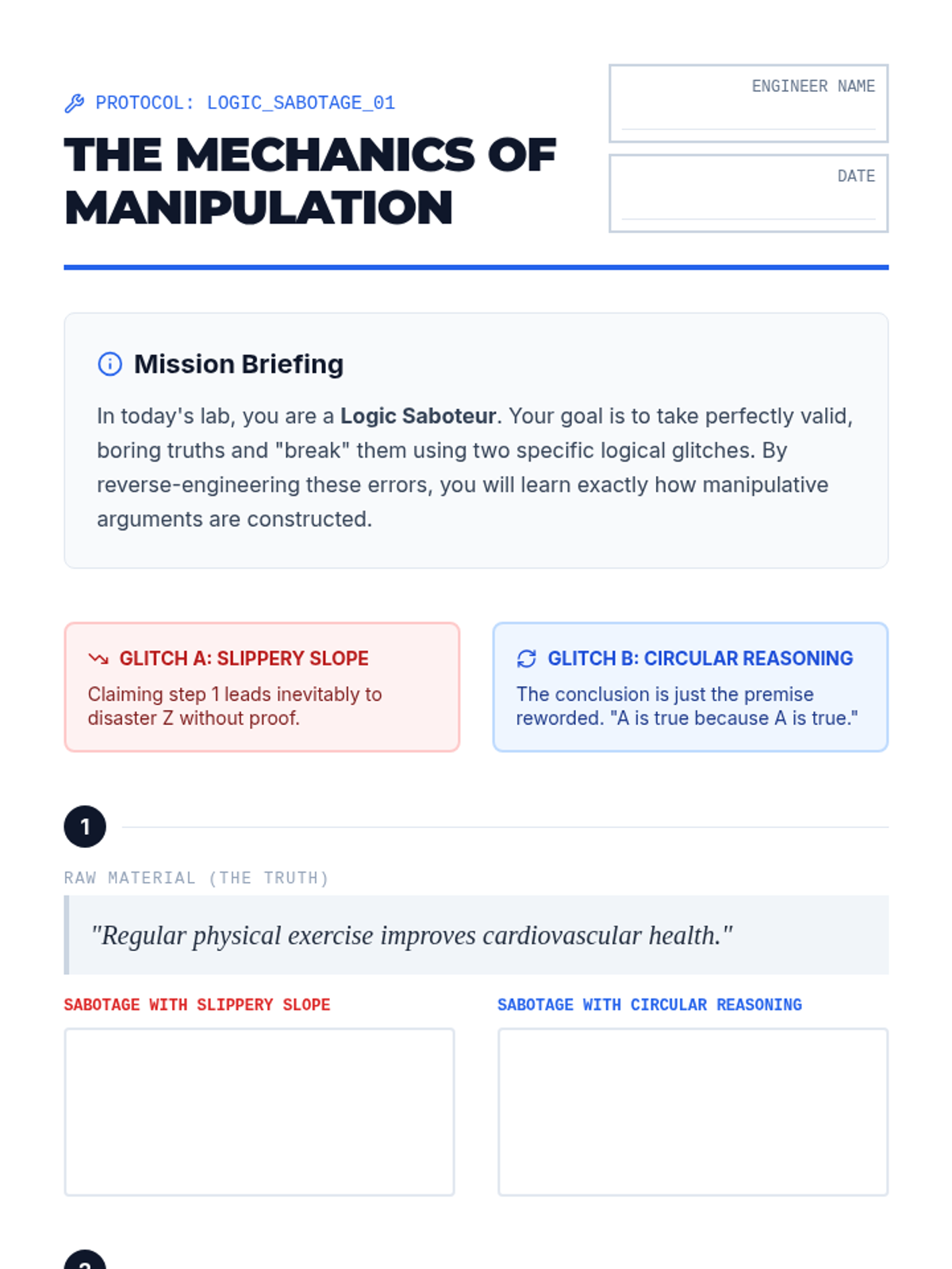 A 10th-grade ELA sequence where students learn logical fallacies by intentionally constructing them. This 'reverse-engineering' approach helps students identify and defend against manipulative rhetoric in the real world.