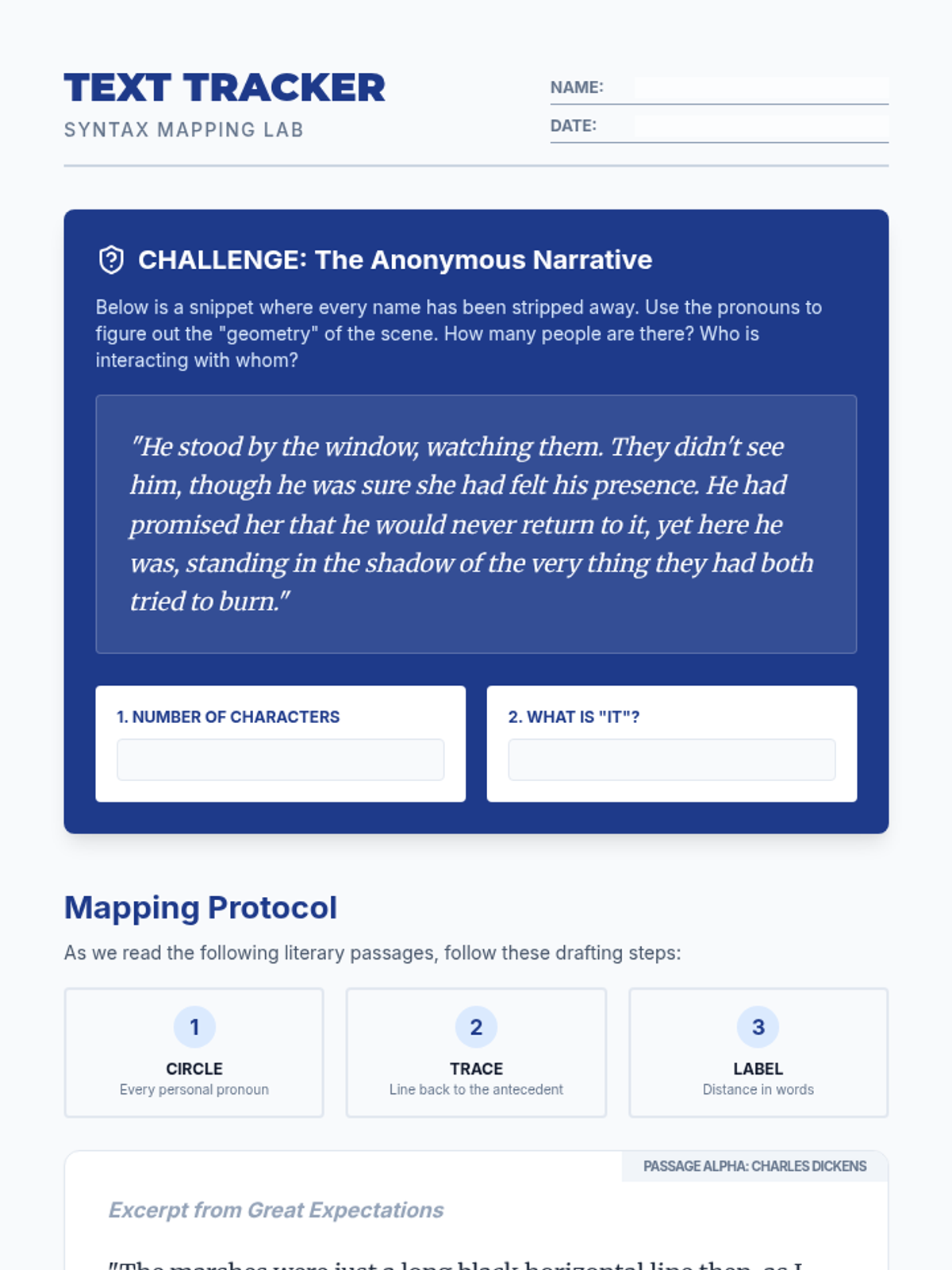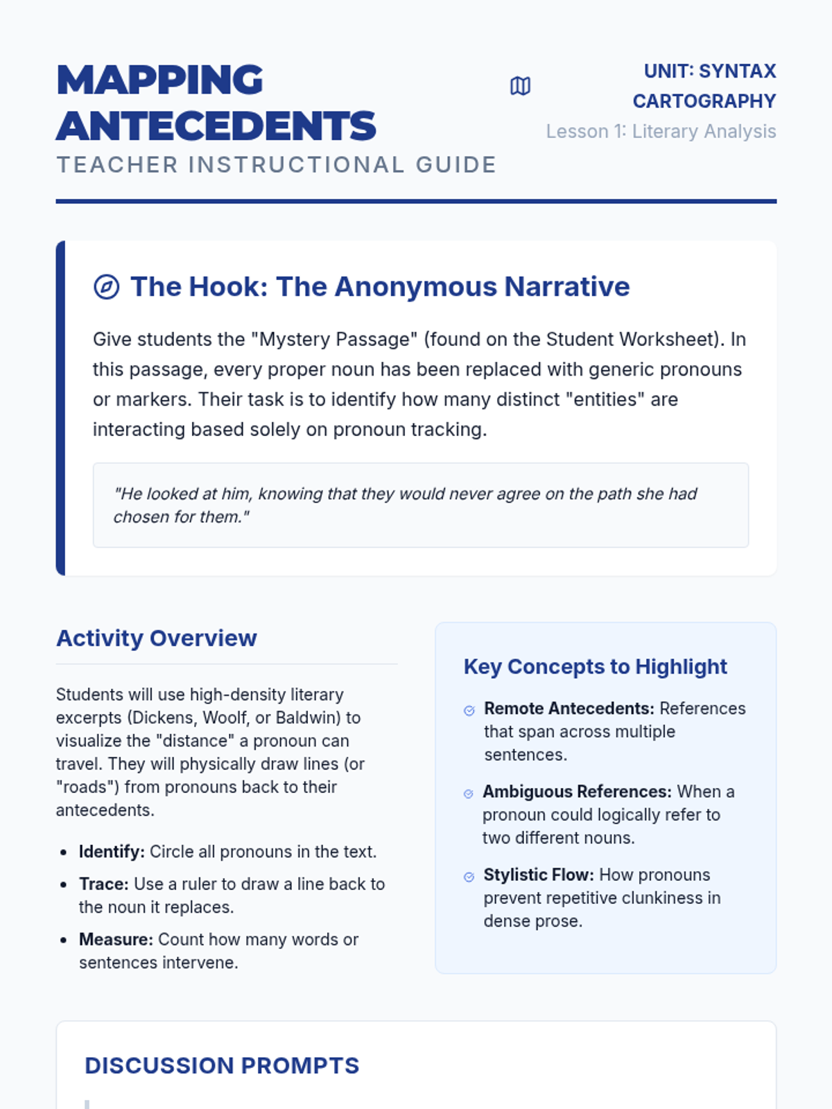 A 10th-grade grammar sequence focusing on the sophisticated use of pronouns and antecedents in complex syntactic structures. Students learn to map references through dense literary texts, handle intervening phrases, and master relative clause agreement to improve both reading comprehension and writing precision.