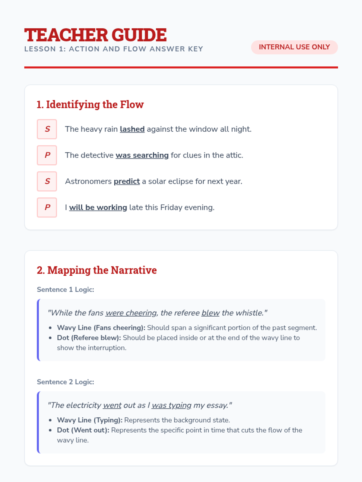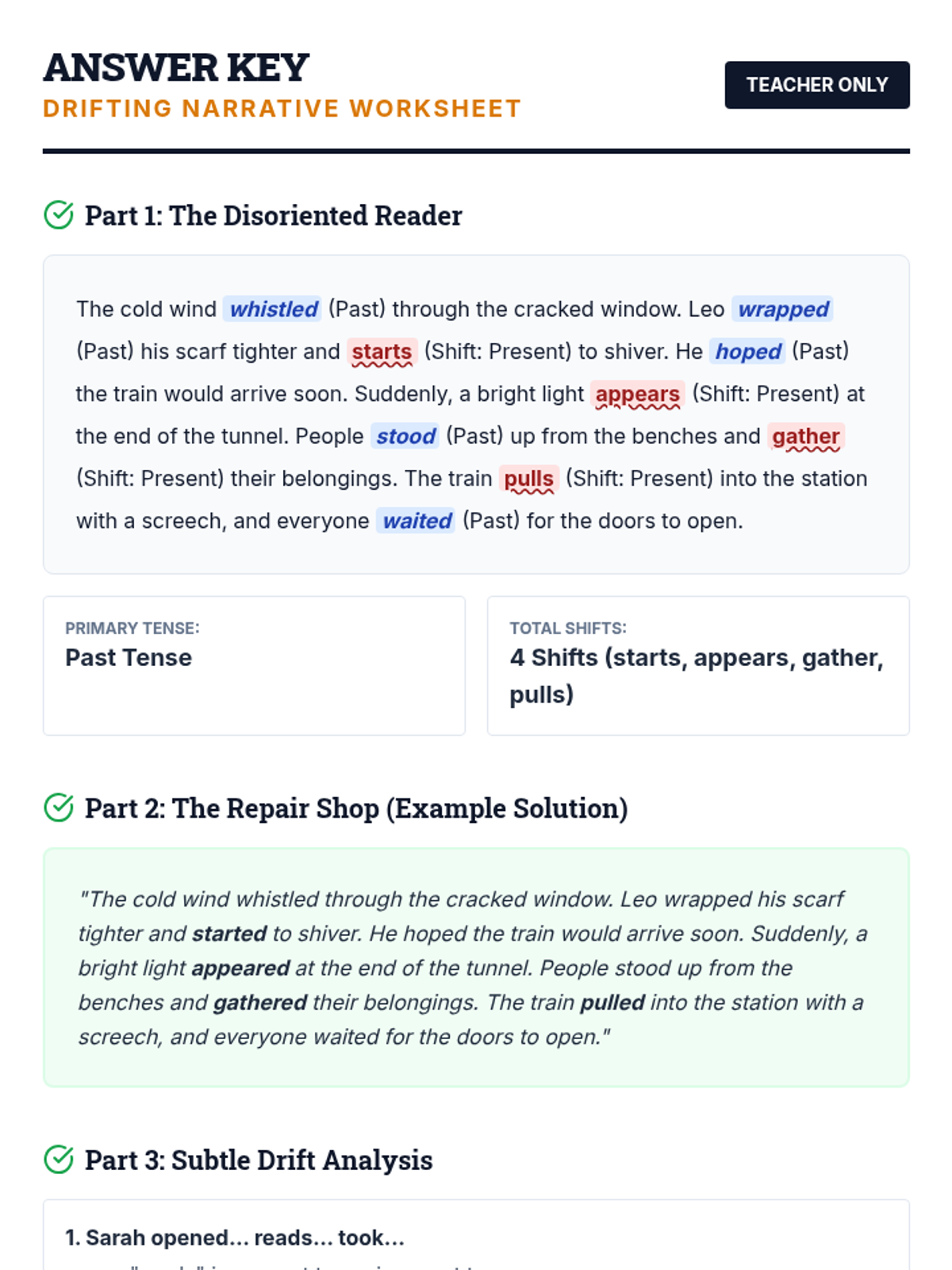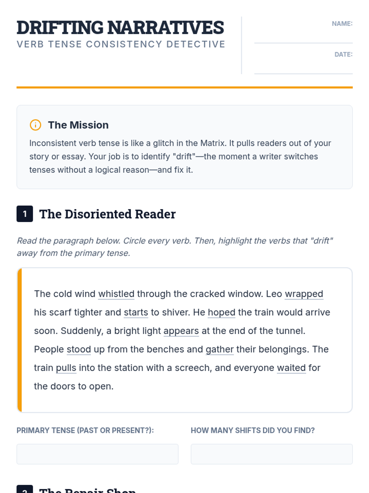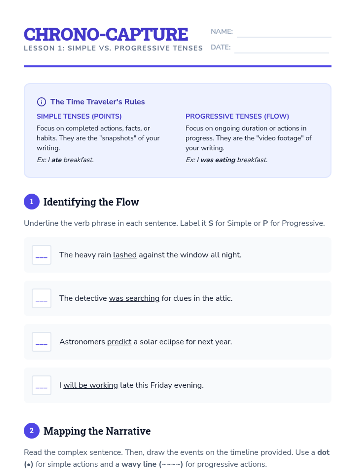 This workshop-style sequence focuses on the nuanced use of perfect and progressive verb tenses to control narrative time and sequencing in advanced writing. Students analyze non-linear narratives, practice sentence combining with perfect aspects, and explore the atmospheric effects of progressive forms to master narrative clarity.