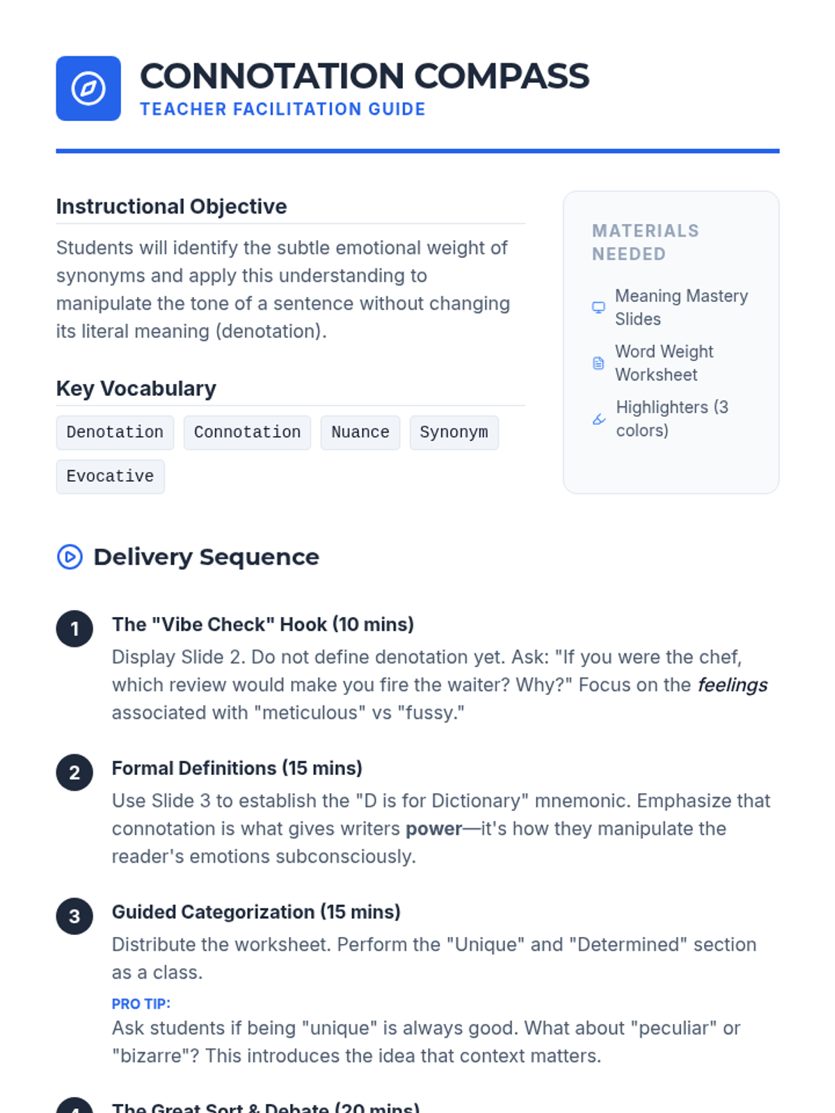 A comprehensive 10th-grade sequence that moves from basic synonym identification to advanced analytical strategies for decoding high-lexile vocabulary. Students use the IDEAS framework, syntactic analysis, and tonal inference to master the skill of determining word meaning in complex texts.