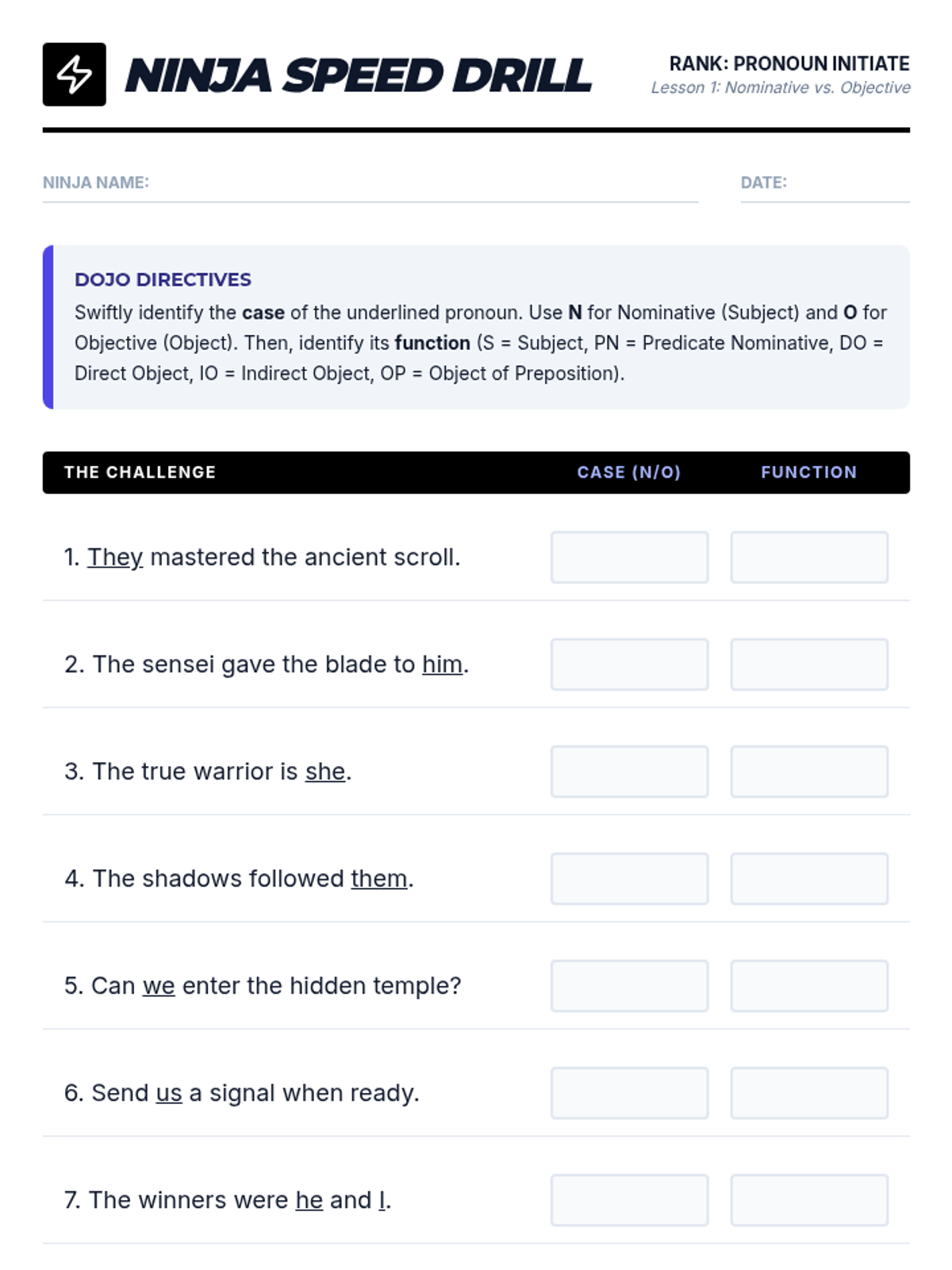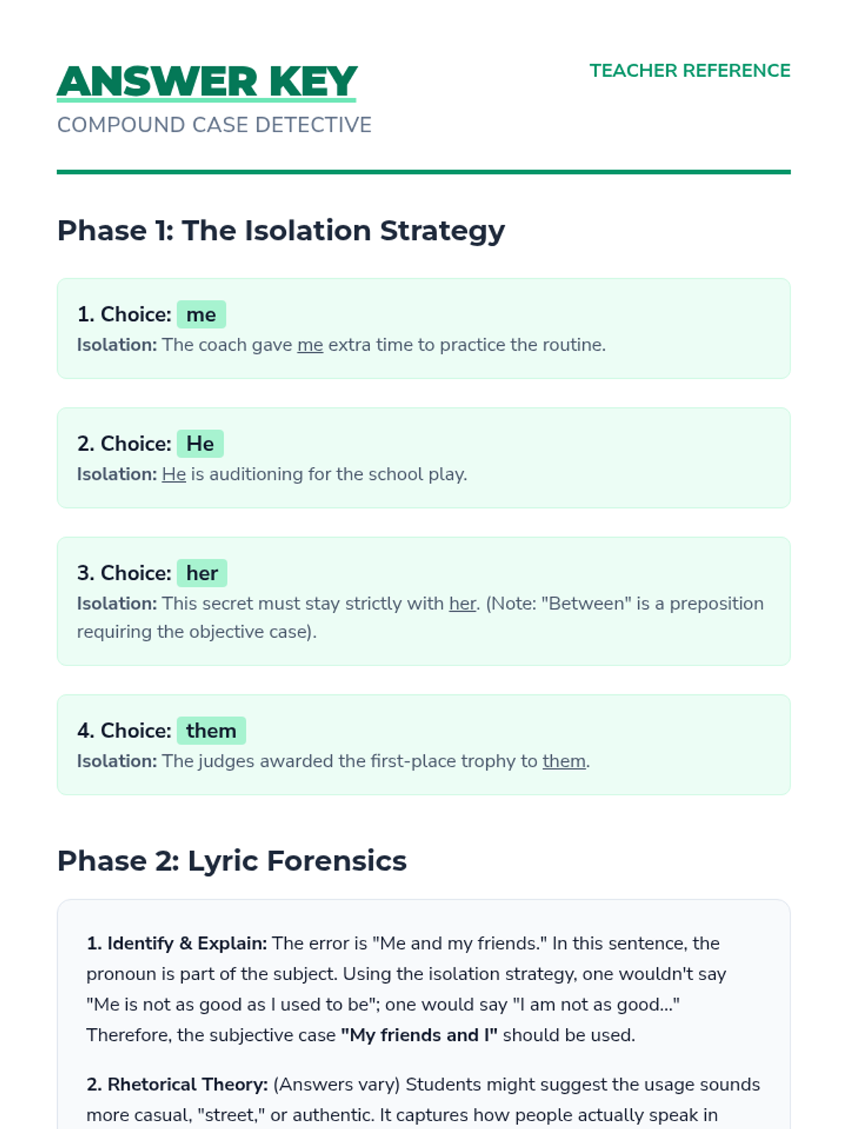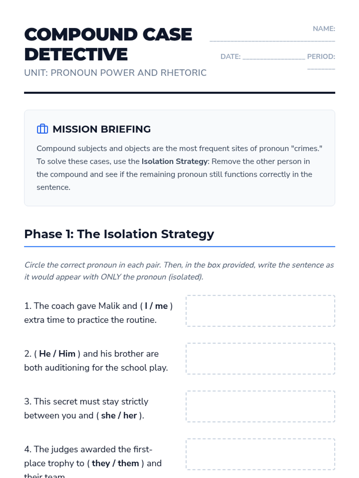 A rigorous sequence designed for 10th-grade mastery of complex pronoun case rules, focusing on compound structures, elliptical comparisons, and appositives. Students use logic-based strategies to navigate advanced grammar mechanics common in standardized testing.
