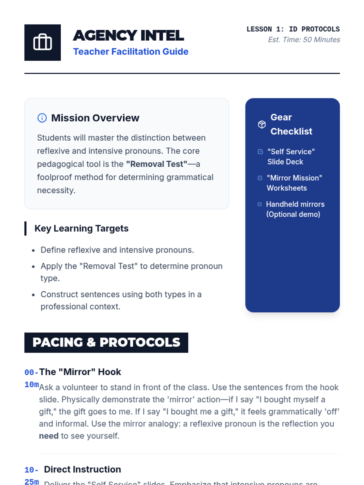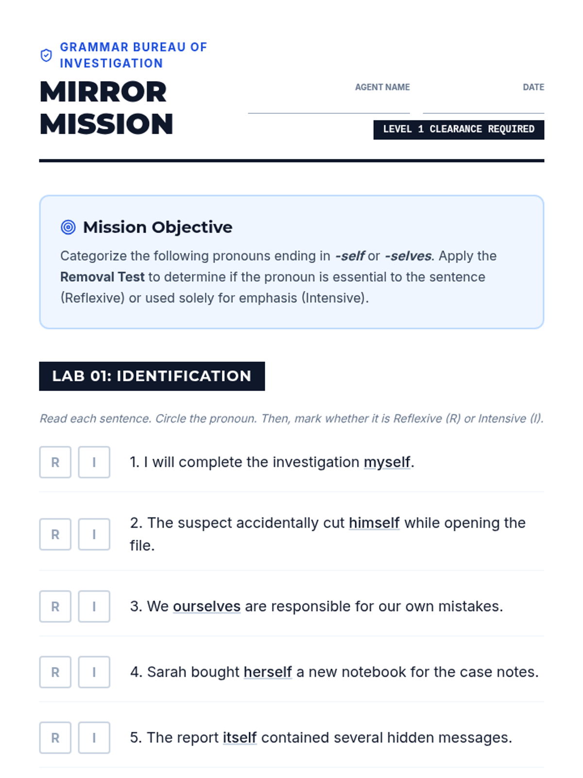 A comprehensive 10th-grade grammar unit focused on reflexive and intensive pronouns, the 'myself' trap, and possessives with gerunds, framed through a high-stakes 'Grammar Bureau of Investigation' simulation.