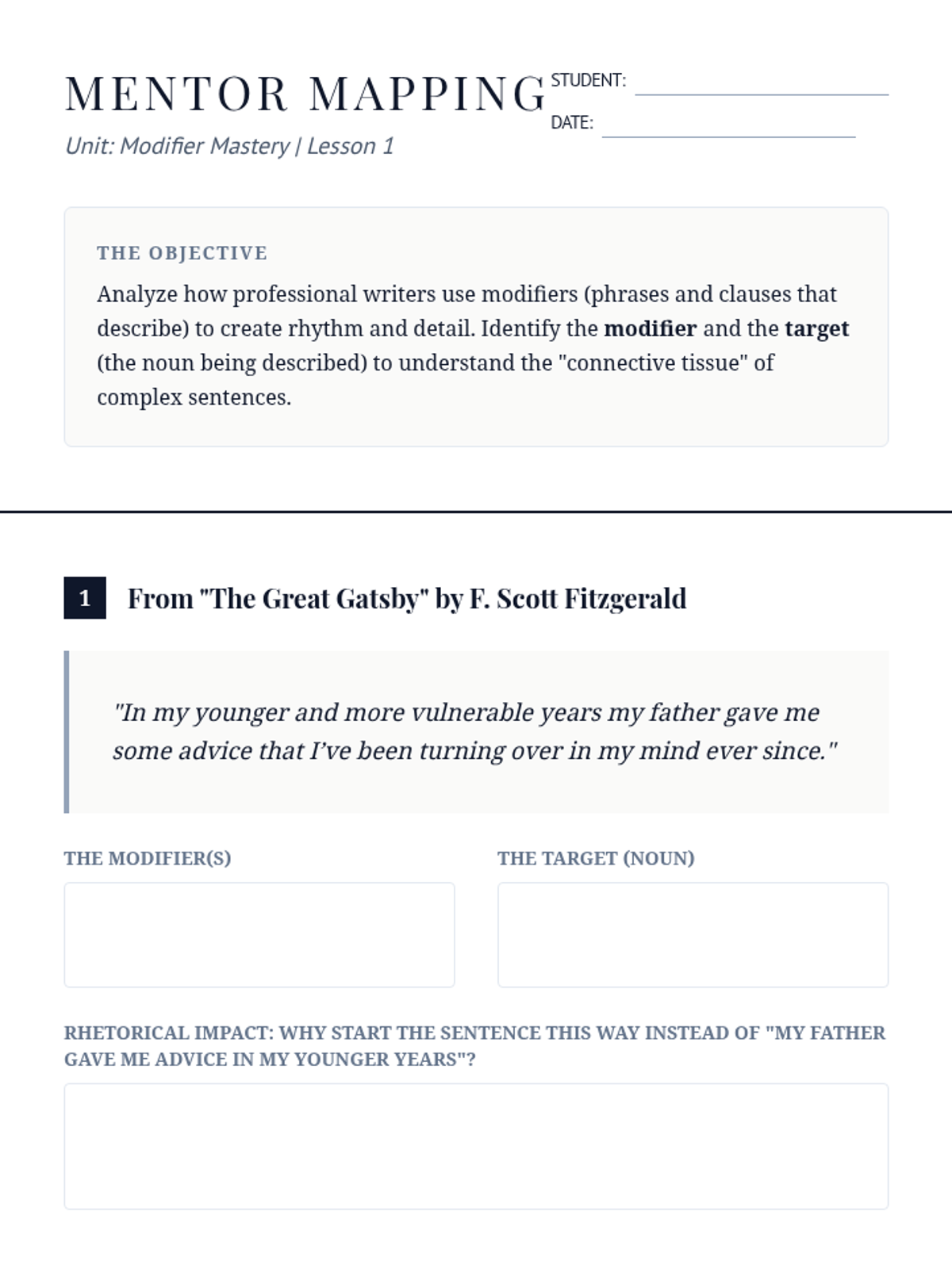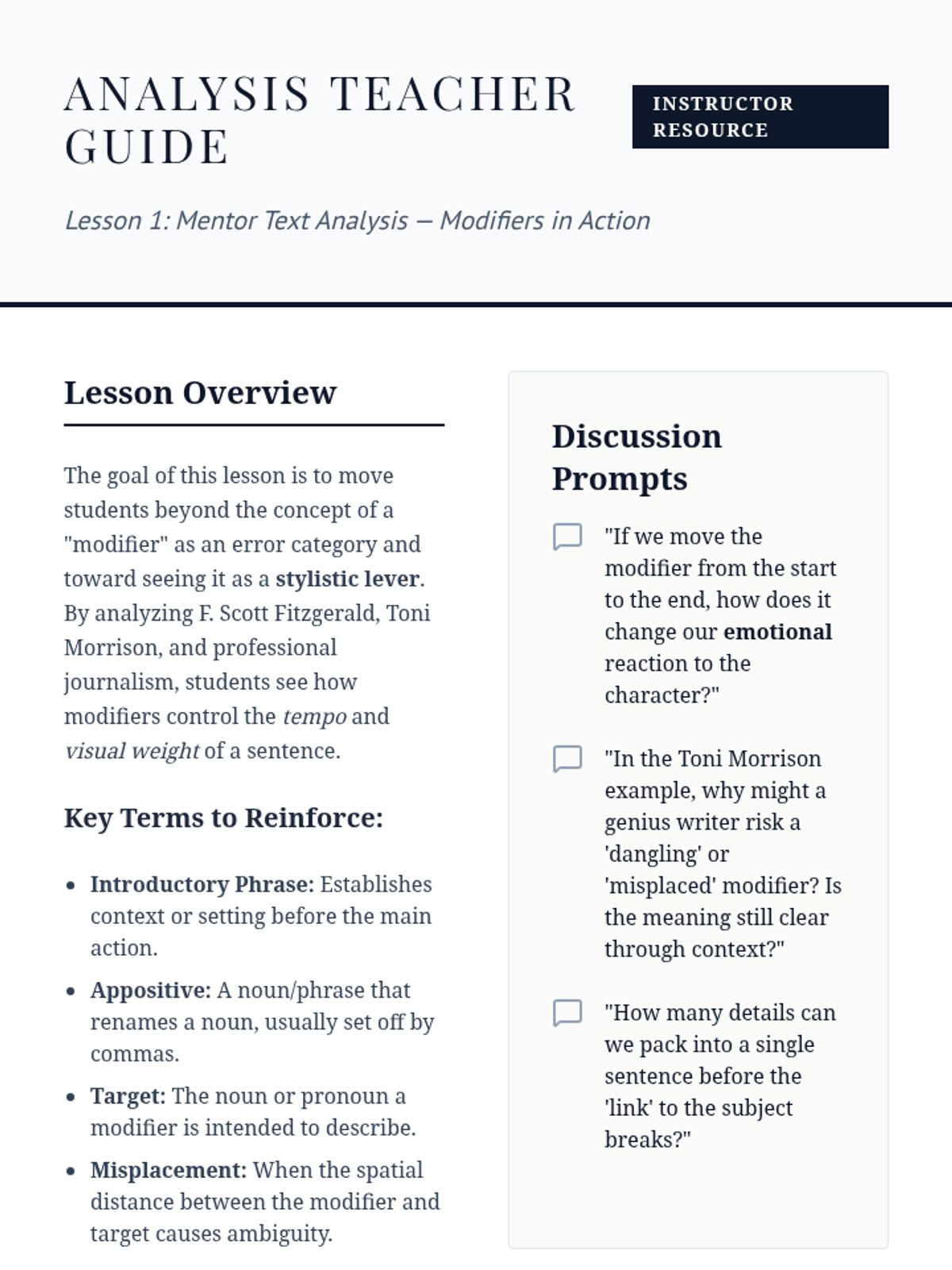 A comprehensive 10th-grade English sequence that transforms modifiers from potential grammatical errors into powerful tools for stylistic precision and descriptive depth. Students analyze professional writing, workshop their own complex sentence structures, and produce a polished narrative portfolio.
