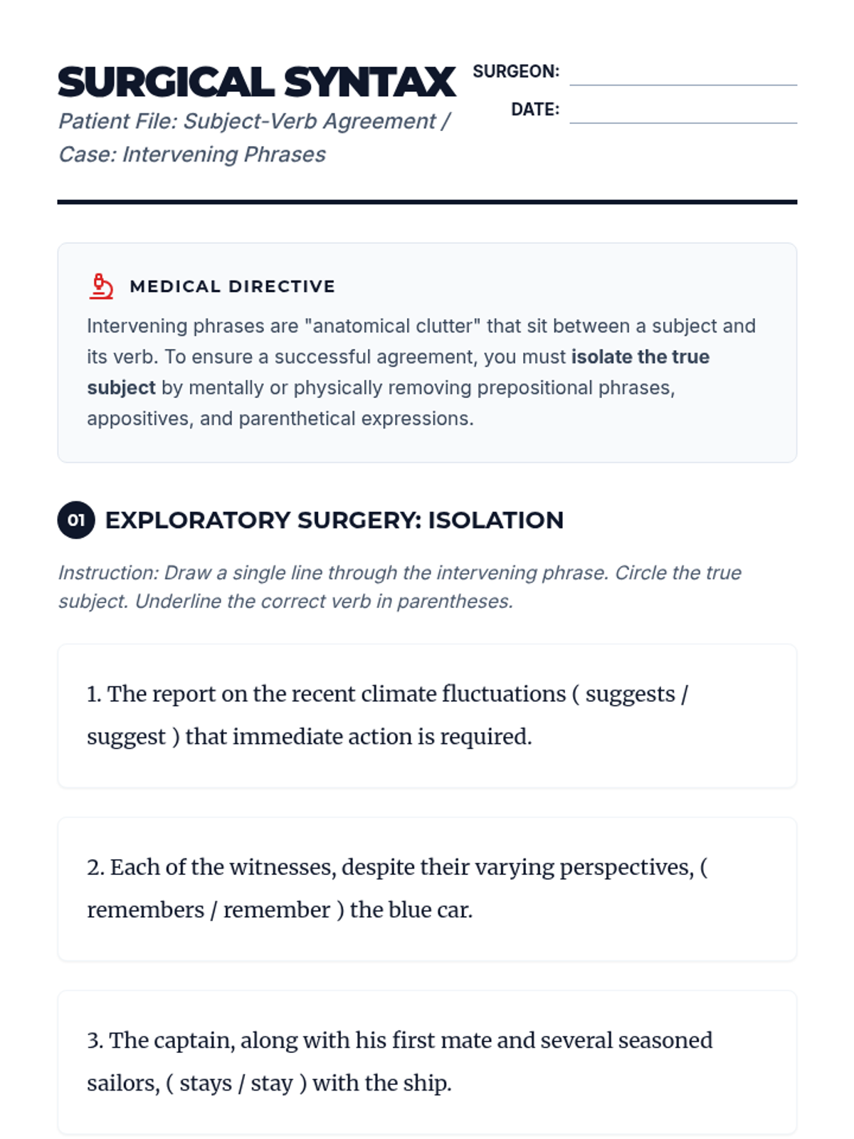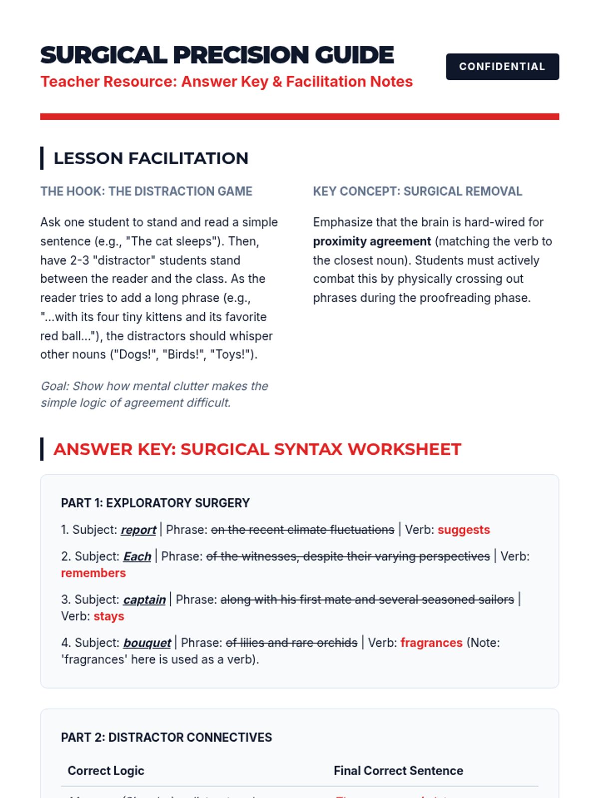 An inquiry-based grammar sequence where students act as linguistic investigators to master subject-verb agreement. Students learn to identify the sentence core, filter out prepositional phrases, handle appositives, and navigate complex modifiers like 'as well as'.
