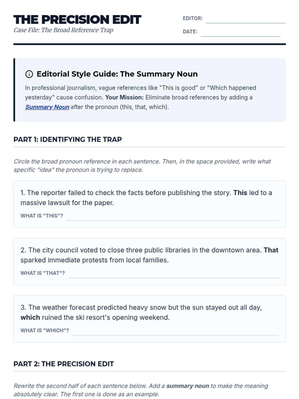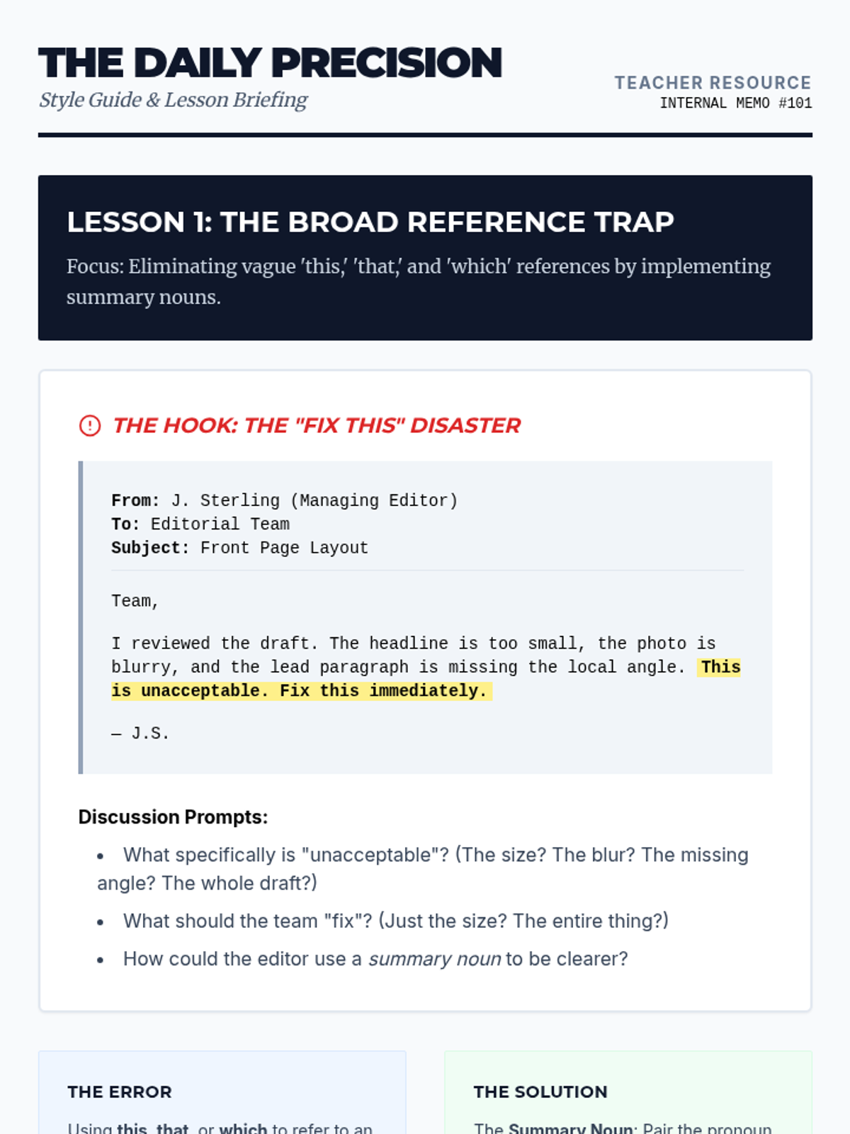 A journalism-themed grammar sequence for 10th grade focused on eliminating vague pronoun references. Students act as editors and reporters to master precision in professional writing by fixing broad references, orphan pronouns, and ambiguous headlines.