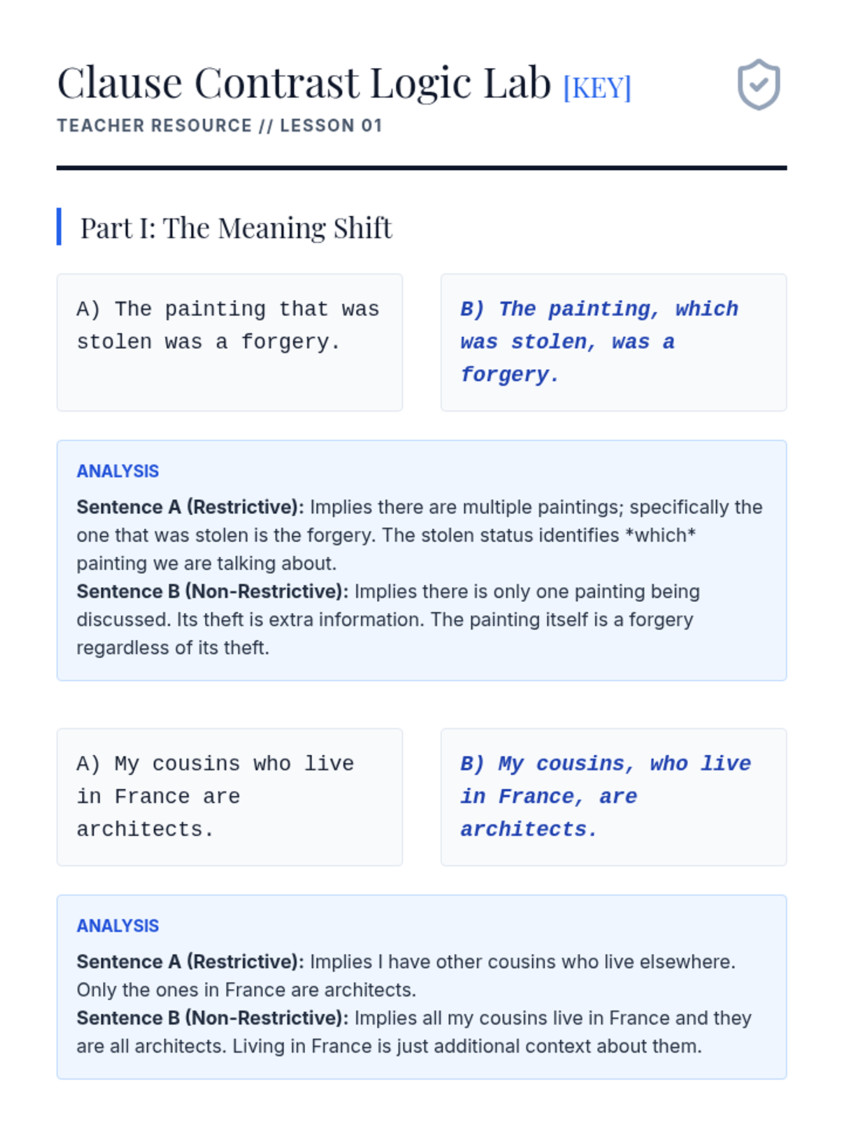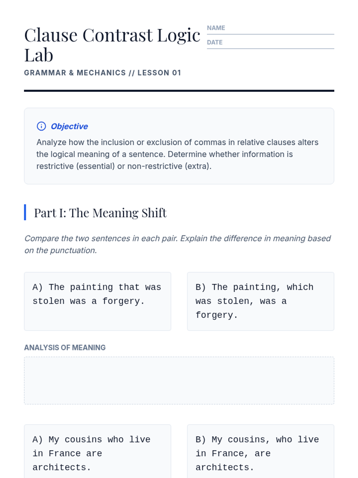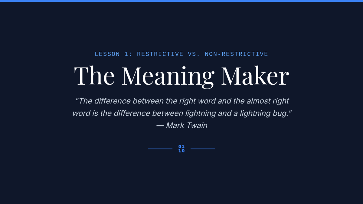 This sequence targets the nuance of advanced comma usage, specifically focusing on restrictive and non-restrictive elements, introductory phrases, and serial commas. Students explore how punctuation dictates the fundamental meaning and truth of academic and legal writing.