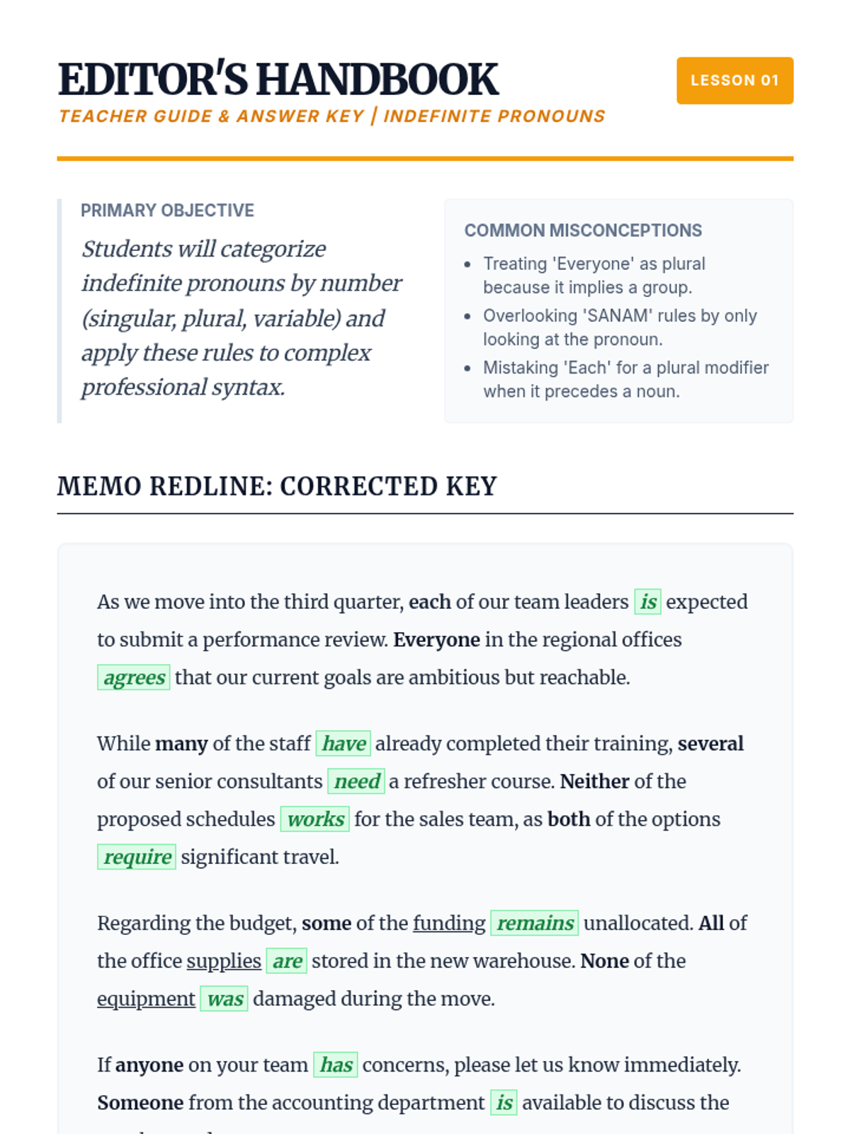 A 10th-grade ELA sequence where students act as professional copy editors to master subject-verb agreement. The curriculum covers indefinite pronouns, collective nouns, measurements, and complex syntax phrases through the lens of professional credibility.
