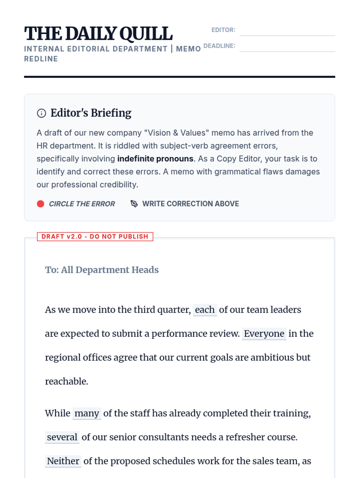 A professional simulation where students act as copy editors, mastering pronouns and antecedents to maintain corporate credibility and clarity.