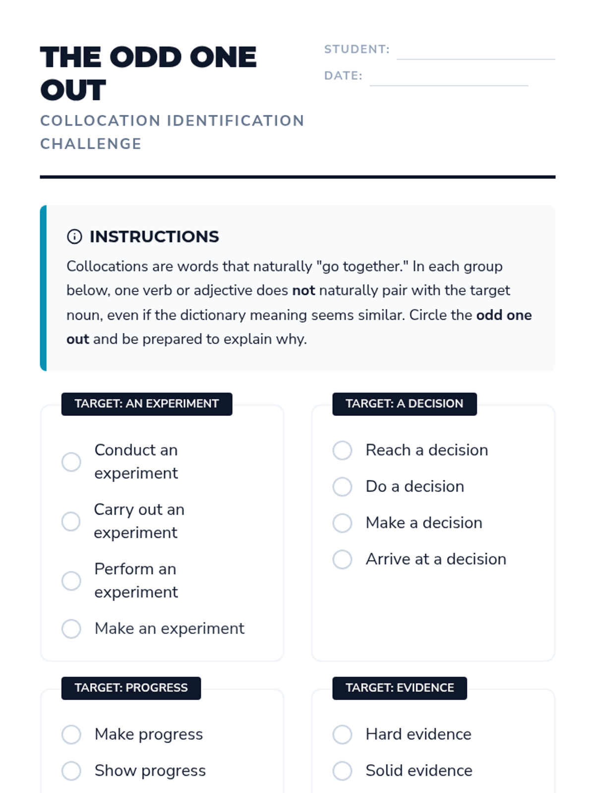 This sequence guides 10th-grade students through the nuances of academic collocations, helping them achieve native-like fluency by mastering natural word partnerships in formal English.