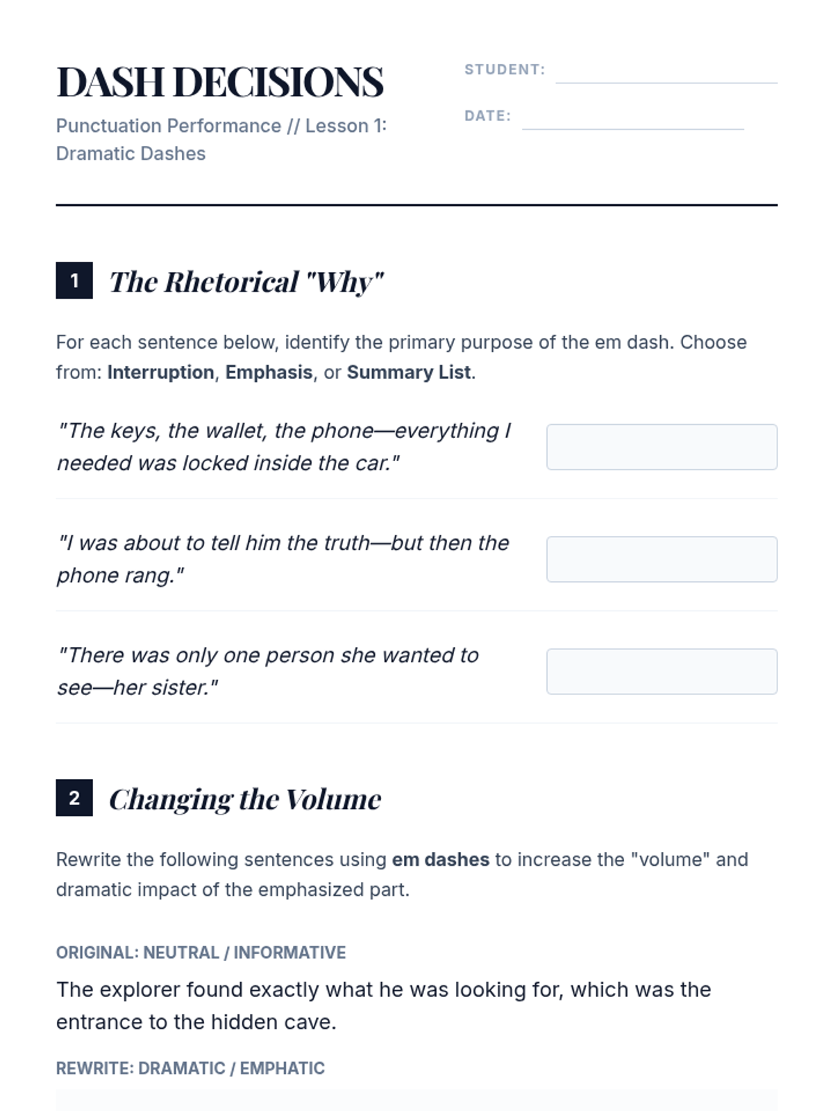 A comprehensive exploration of advanced punctuation as a tool for rhetorical control. 10th-grade students learn to manipulate semicolons, colons, em-dashes, and hyphens to control pacing, emphasis, and tone in their writing.