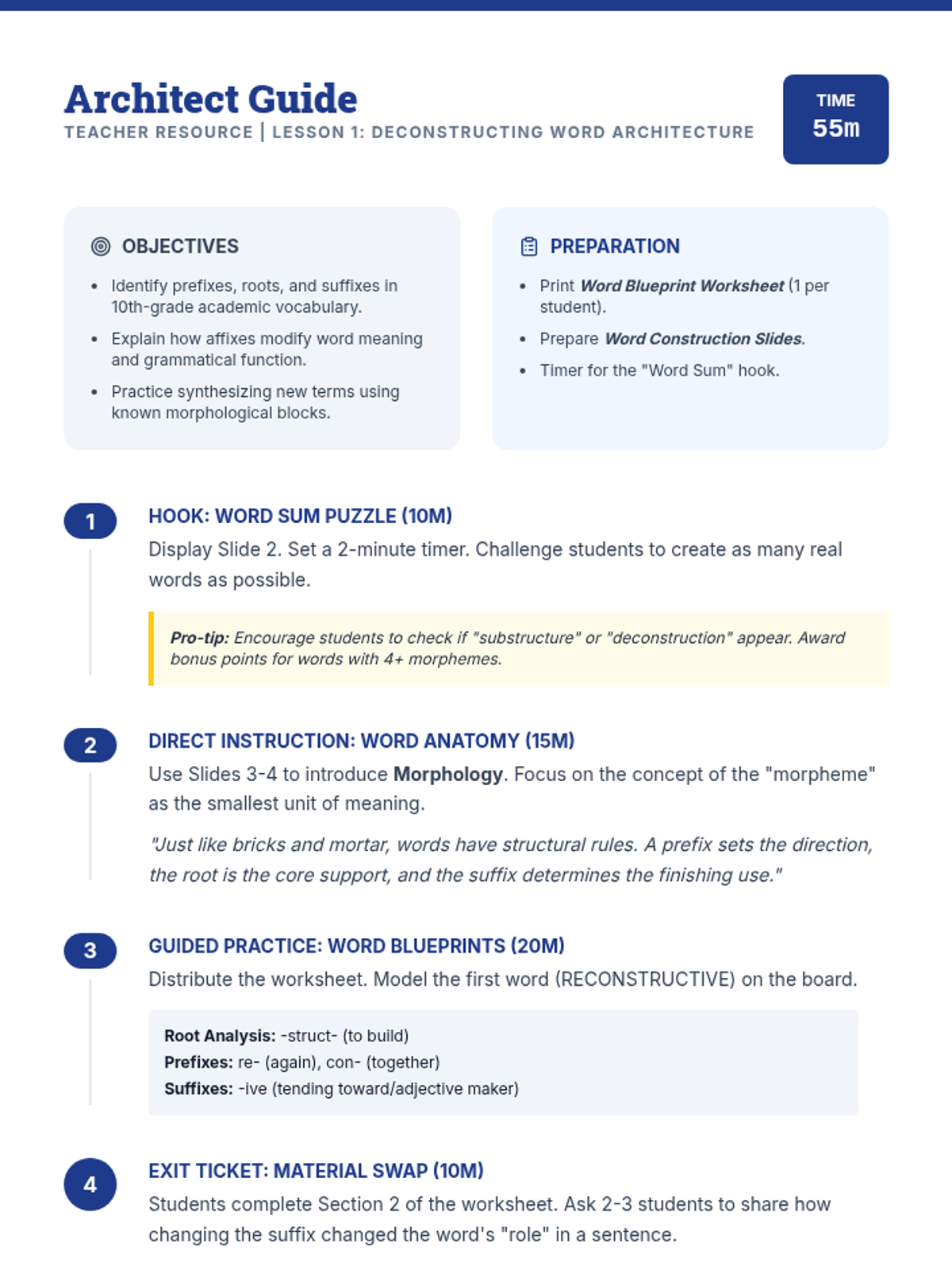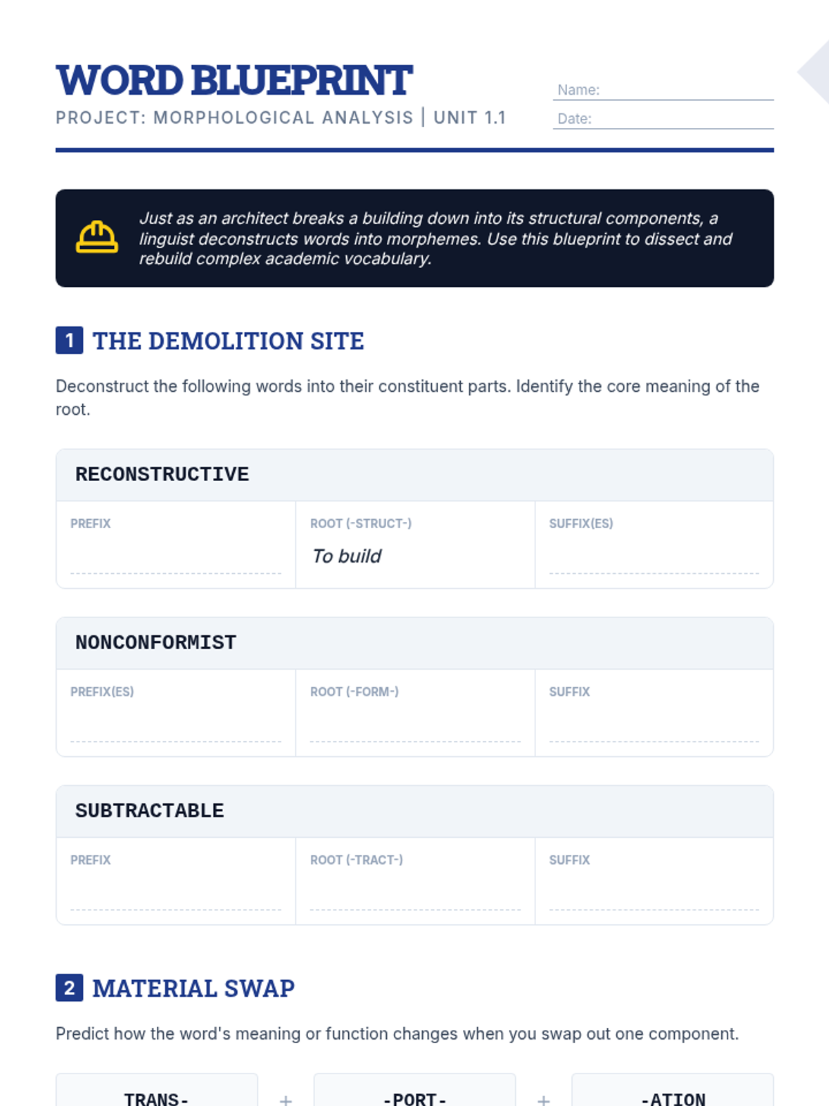 This high-school unit moves beyond rote memorization into the structural analysis of language through morphology and etymology, focusing on high-utility Greek and Latin roots found in rhetoric, science, and law.