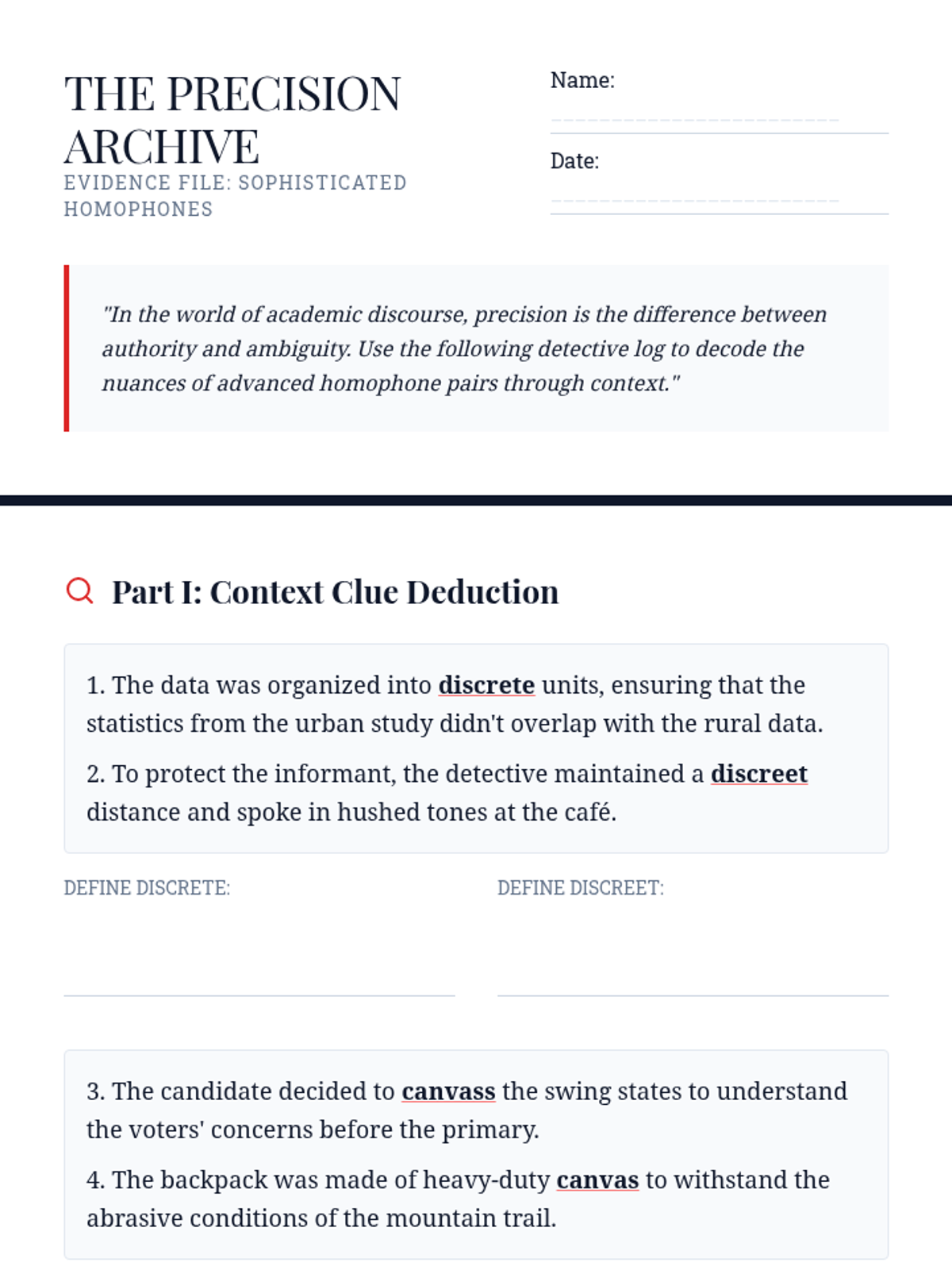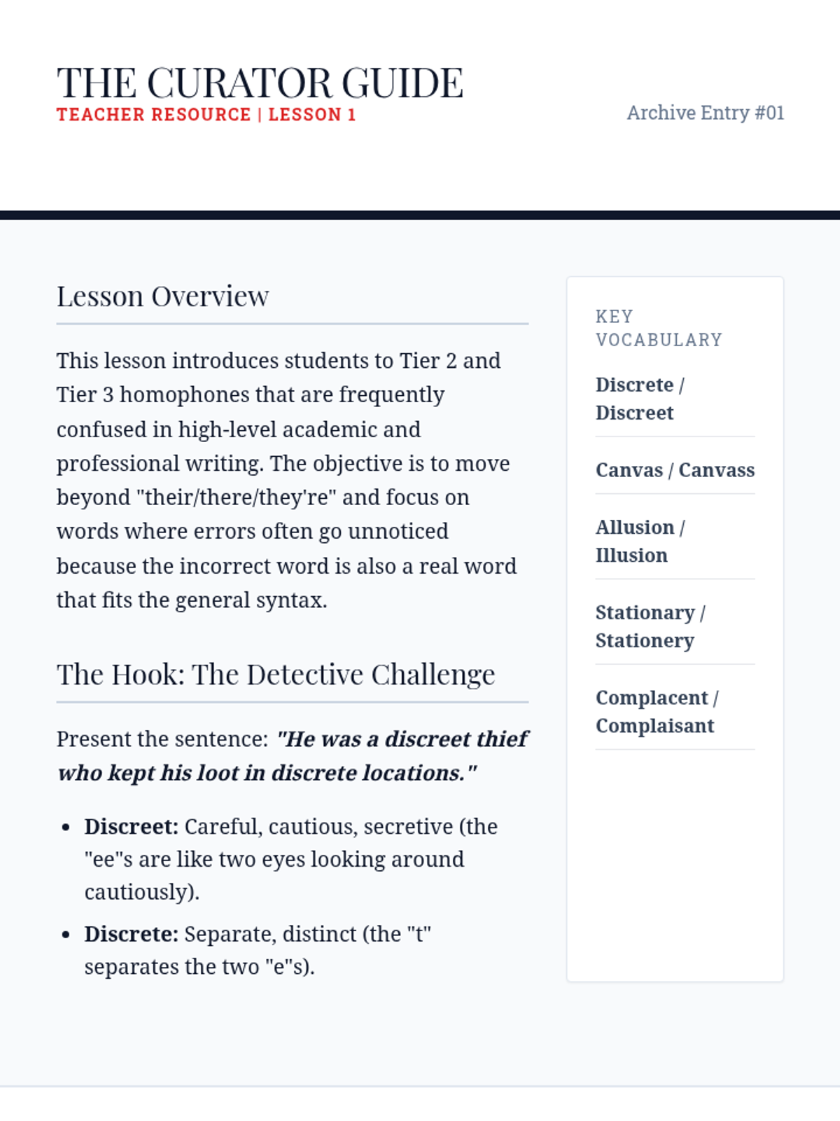 This mastery-based sequence for 9th-grade students focuses on advanced academic homophones (Tier 2 and 3) such as elicit/illicit, discrete/discreet, and affect/effect. Students progress from self-assessment to contextual analysis and final proficiency, bridging the gap between vocabulary acquisition and precise academic writing.