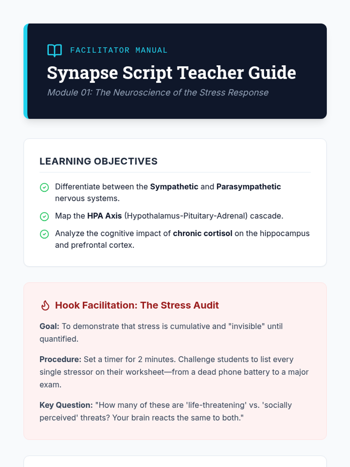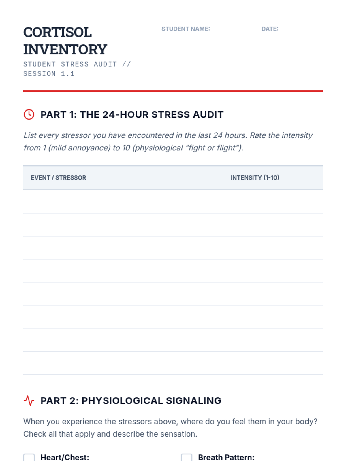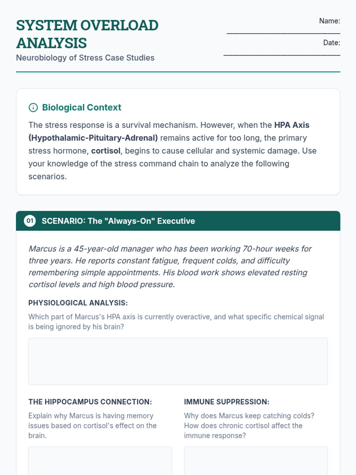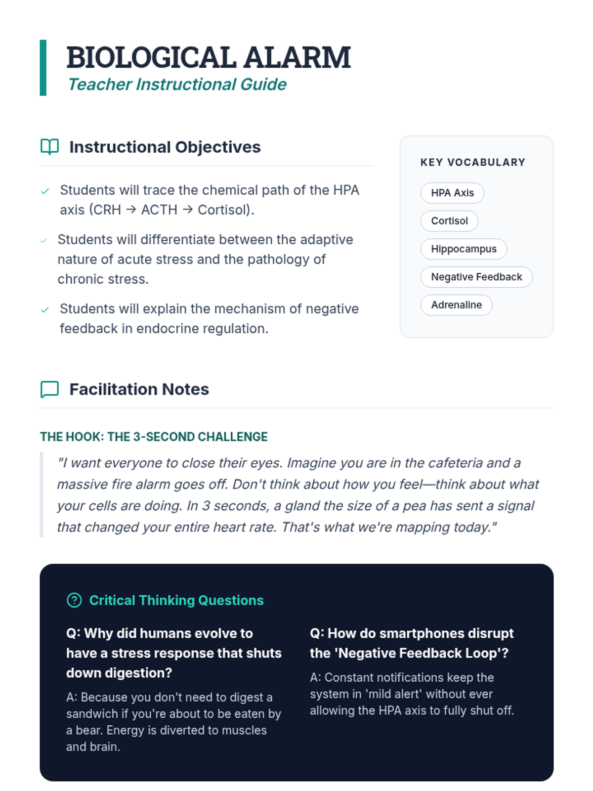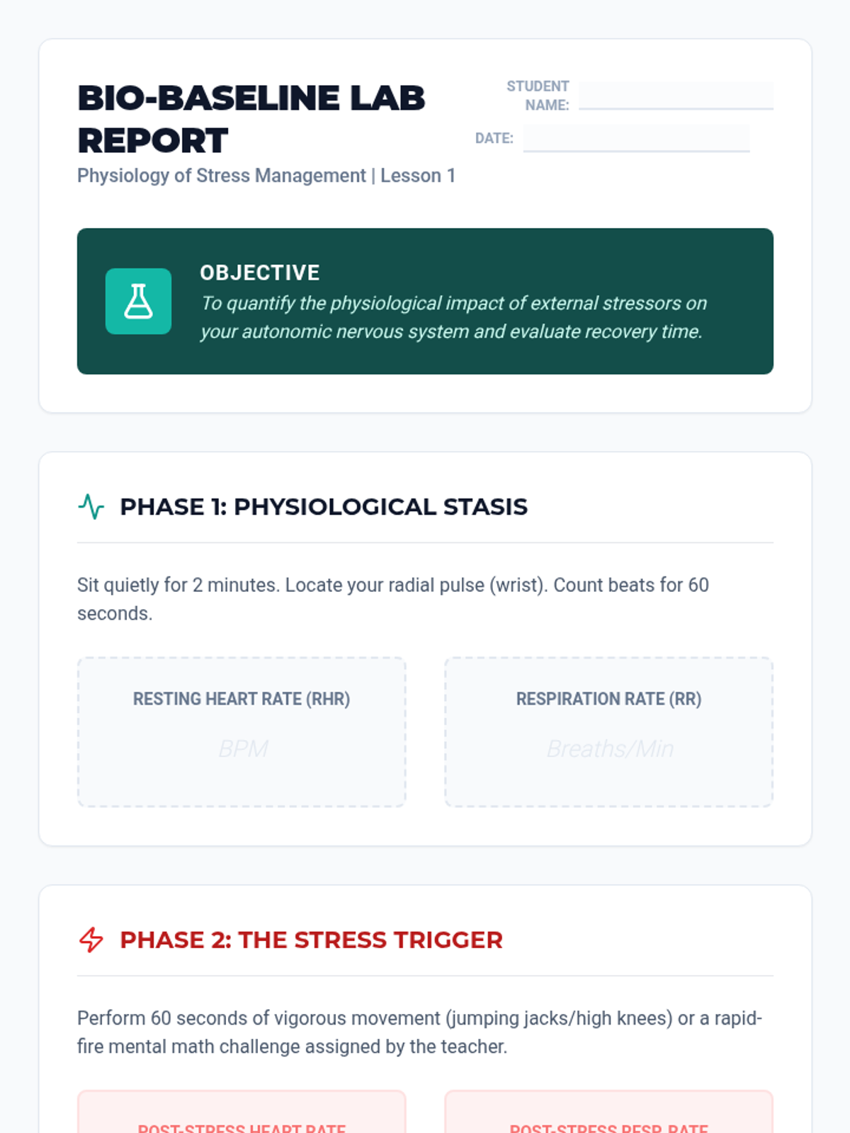 A high school health sequence that explores the neurobiological foundations of stress, focusing on the HPA axis, physiological symptom recognition, biofeedback techniques, and cognitive reframing to create a personalized stress regulation protocol.