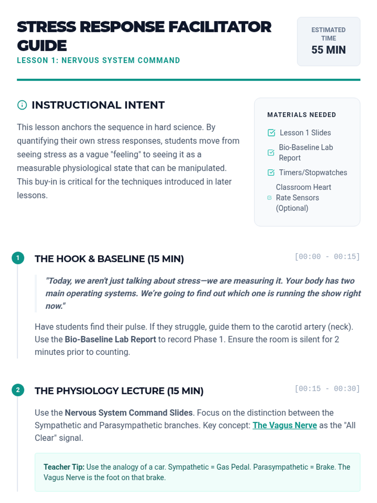 A high school health sequence bridging biological understanding of the autonomic nervous system with practical stress-regulation protocols like Box Breathing and Progressive Muscle Relaxation. Students move from scientific inquiry to the creation of a personalized bio-regulation plan for high-stakes scenarios.