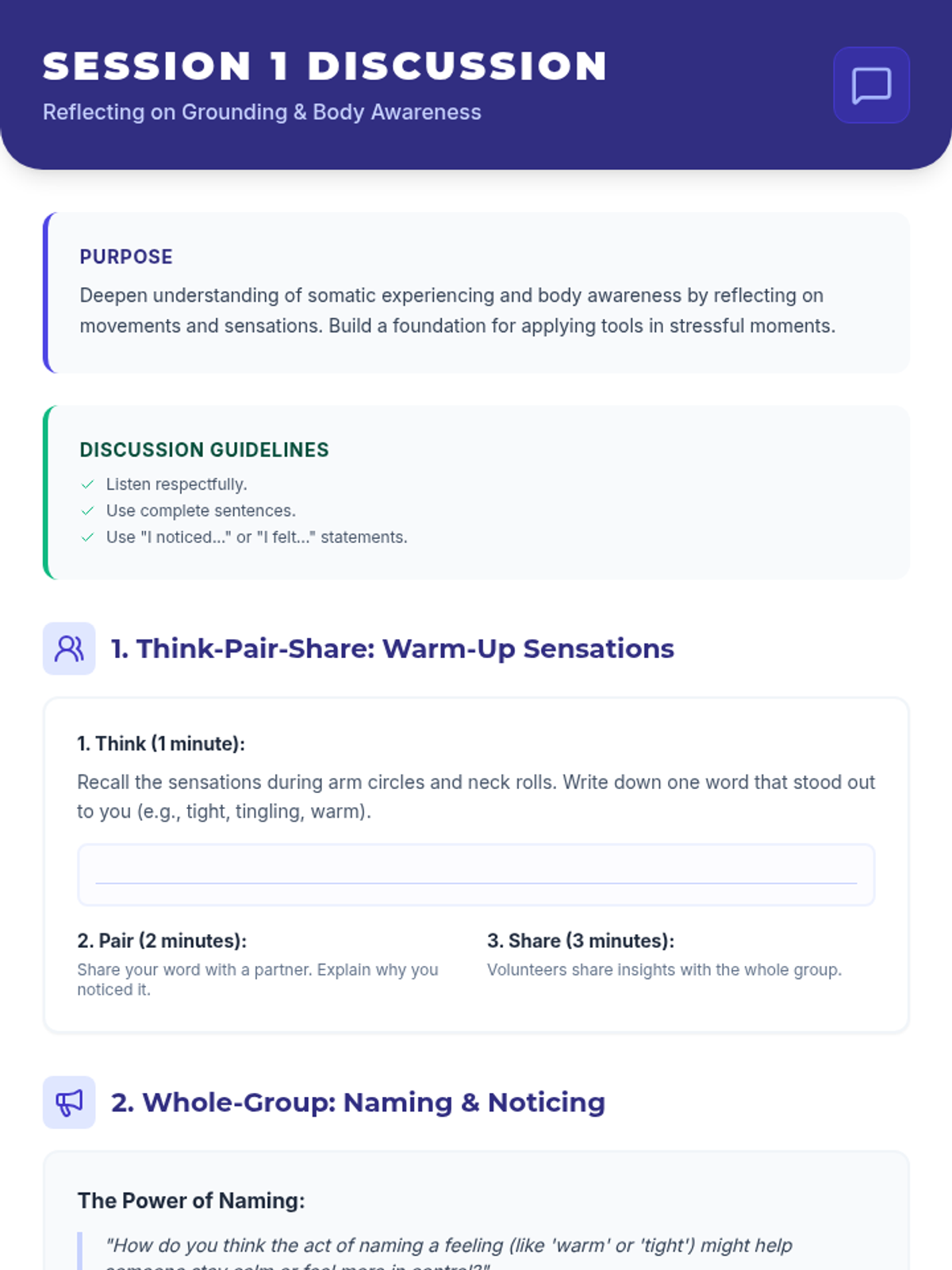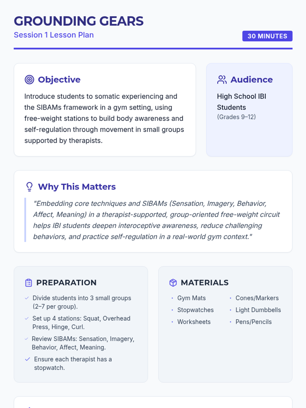 A 14-session series for high school IBI students that integrates somatic experiencing techniques (SIBAMs) into gym-based workouts to improve self-regulation and reduce challenging behaviors.