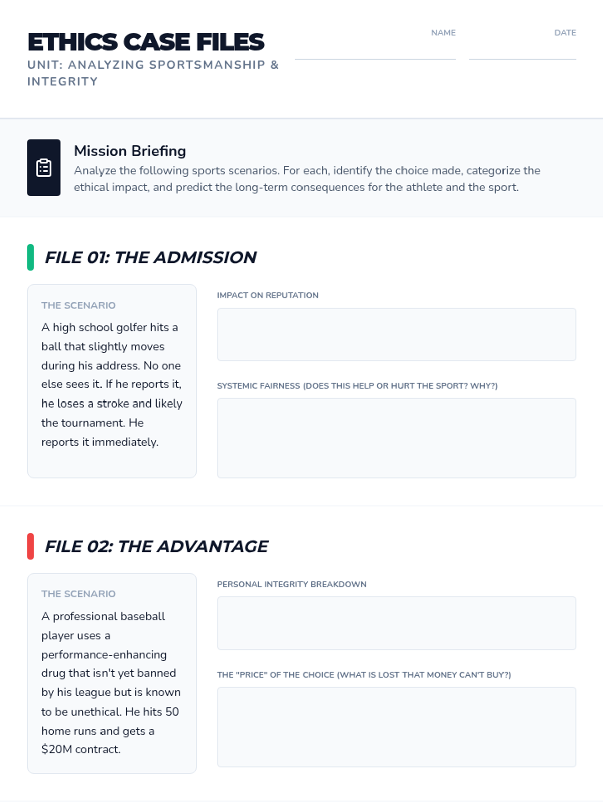 This sequence challenges 9th-grade students to analyze ethical dilemmas in sports, from doping to altruism. Students examine the pressures of competition, empathy for officials, and the boundary between competitive banter and verbal abuse, culminating in the creation of a personal 'Athlete's Code of Ethics'.