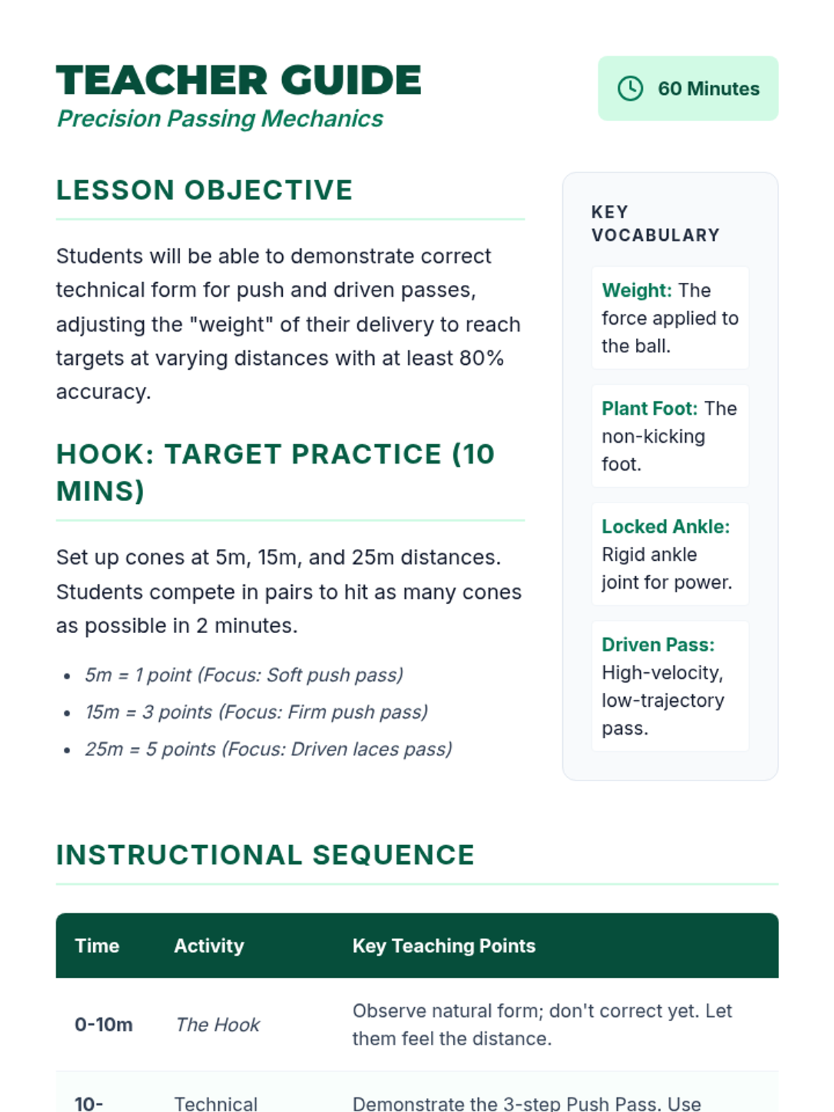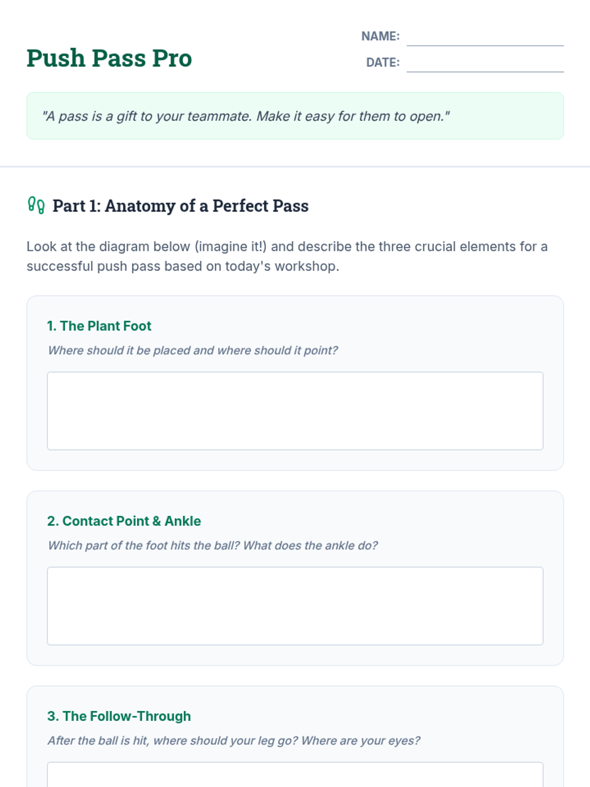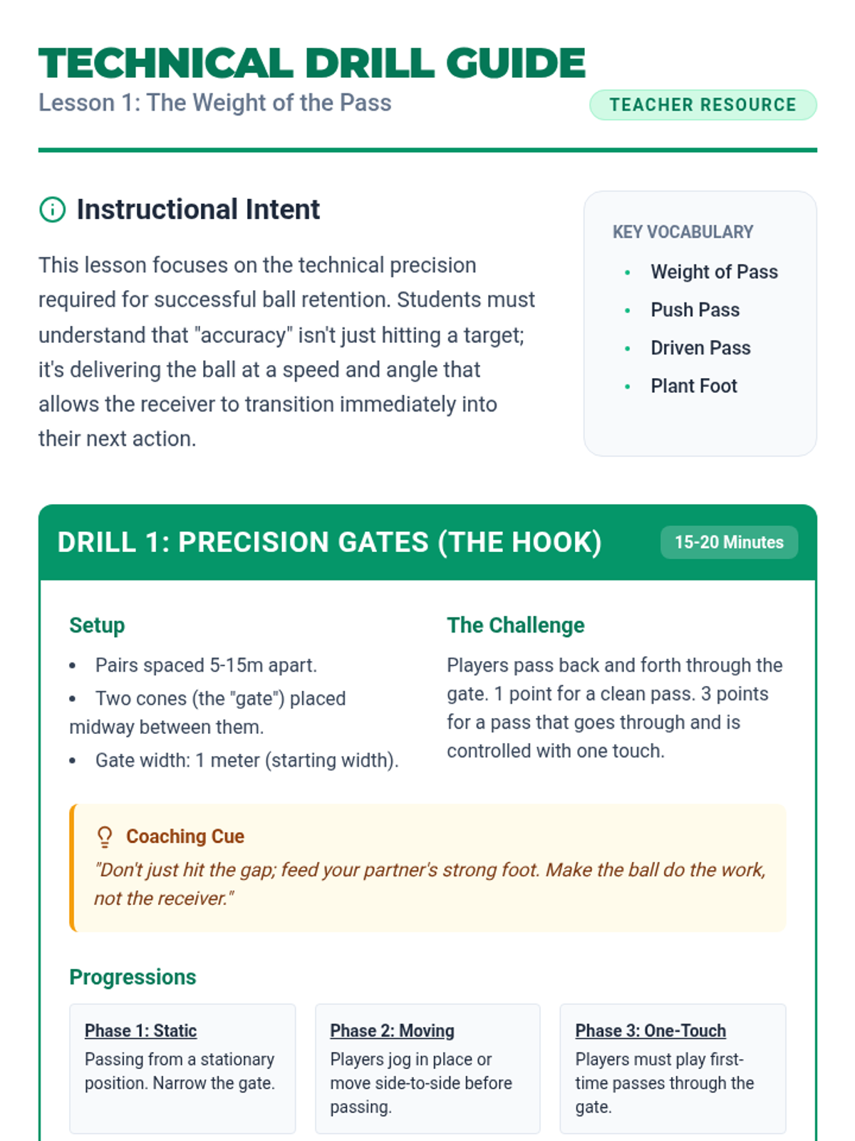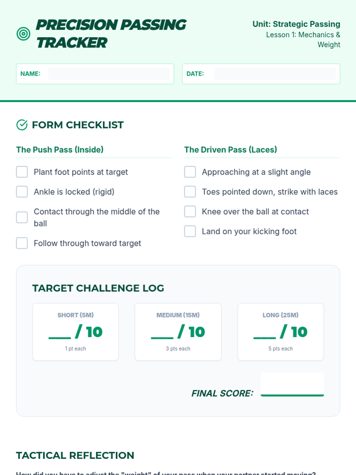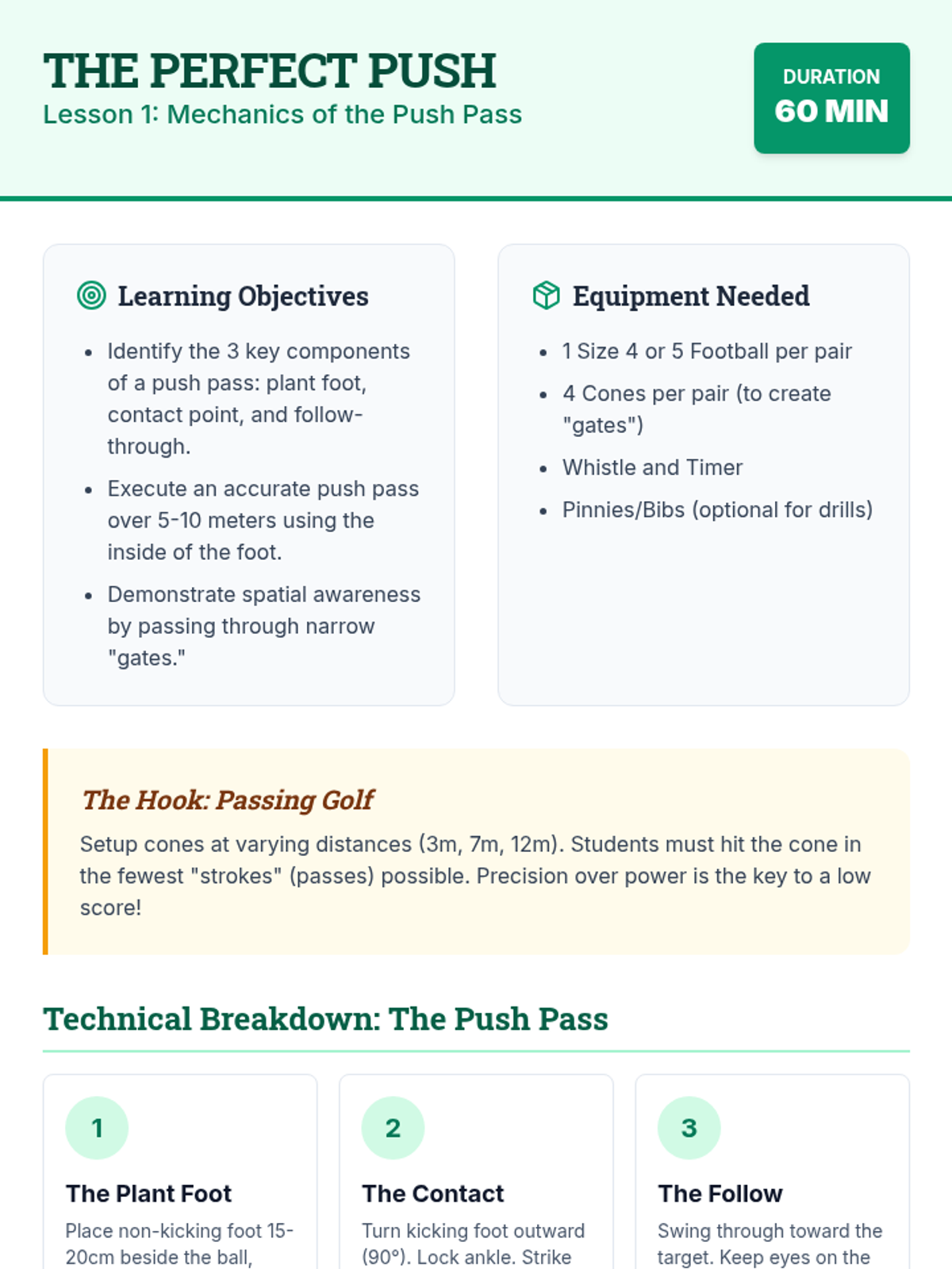 This unit moves students from individual technical mastery of the push pass and first touch to complex tactical application in combination play and possession games. Emphasis is placed on biomechanics, spatial awareness, and the 'language' of passing to build a cohesive team unit.