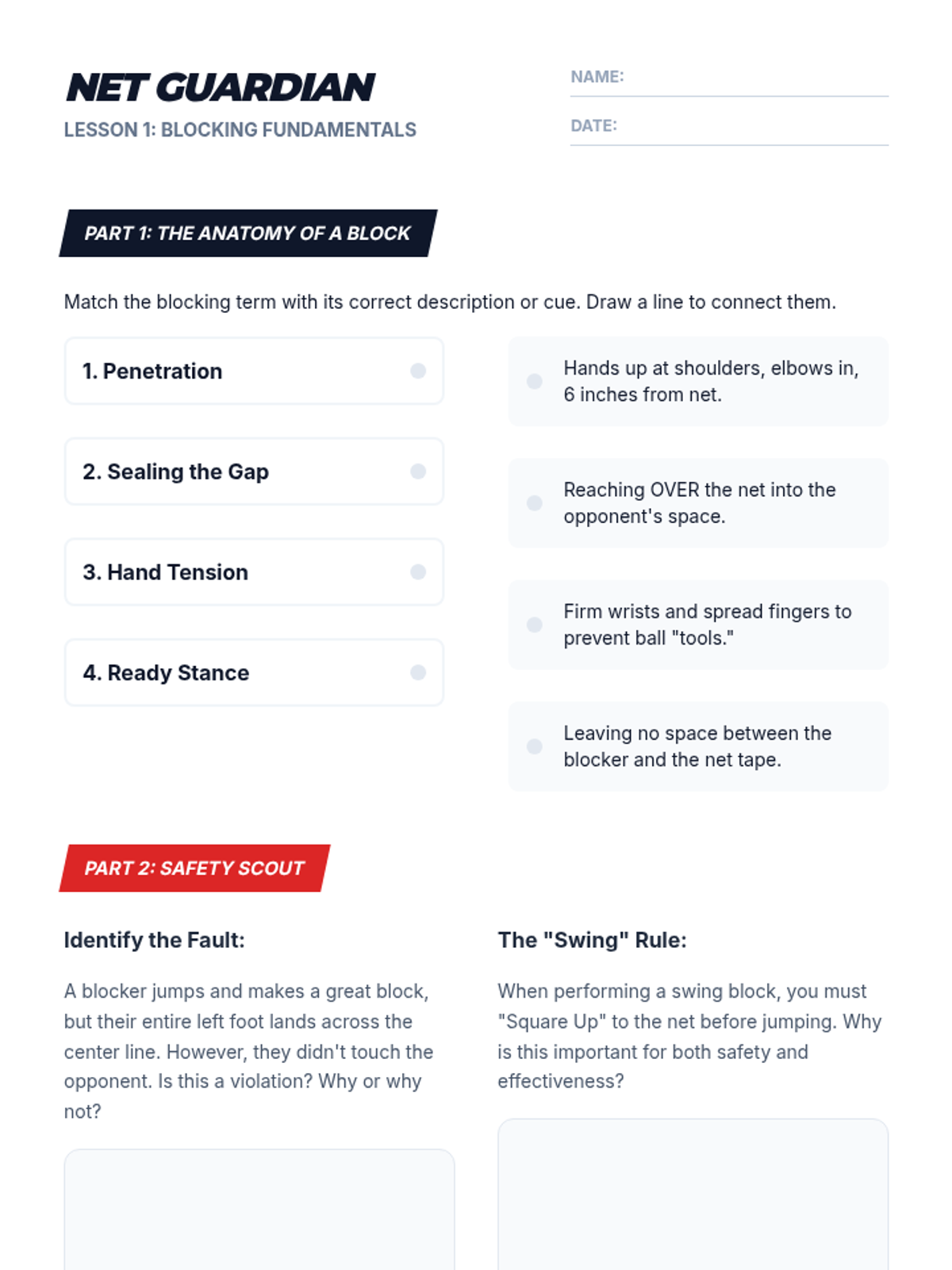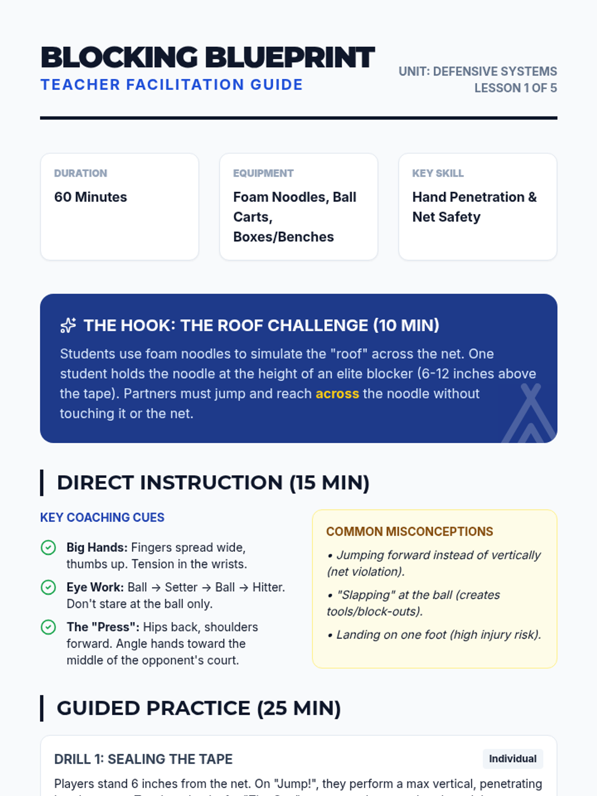 A comprehensive unit for 10th-grade students on advanced volleyball defensive tactics, focusing on individual mechanics, reading offensive cues, and team-based defensive systems. Students will progress from foundational blocking safety to complex rotational coverage.