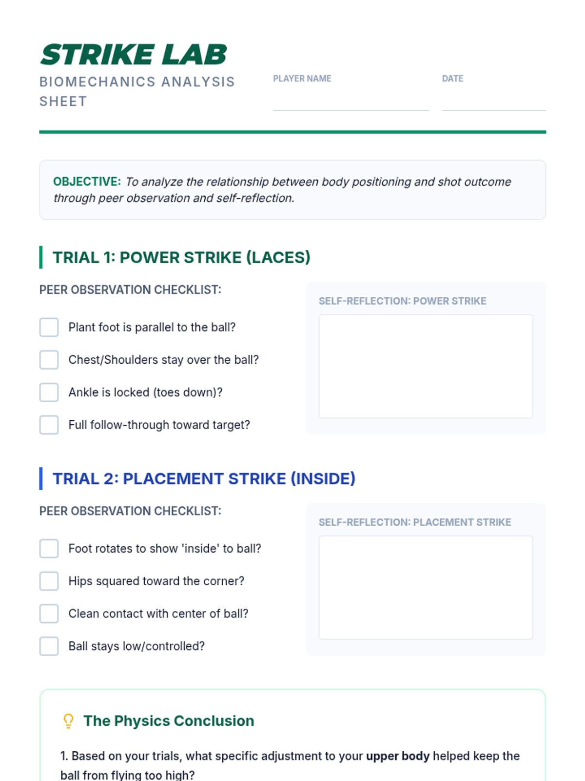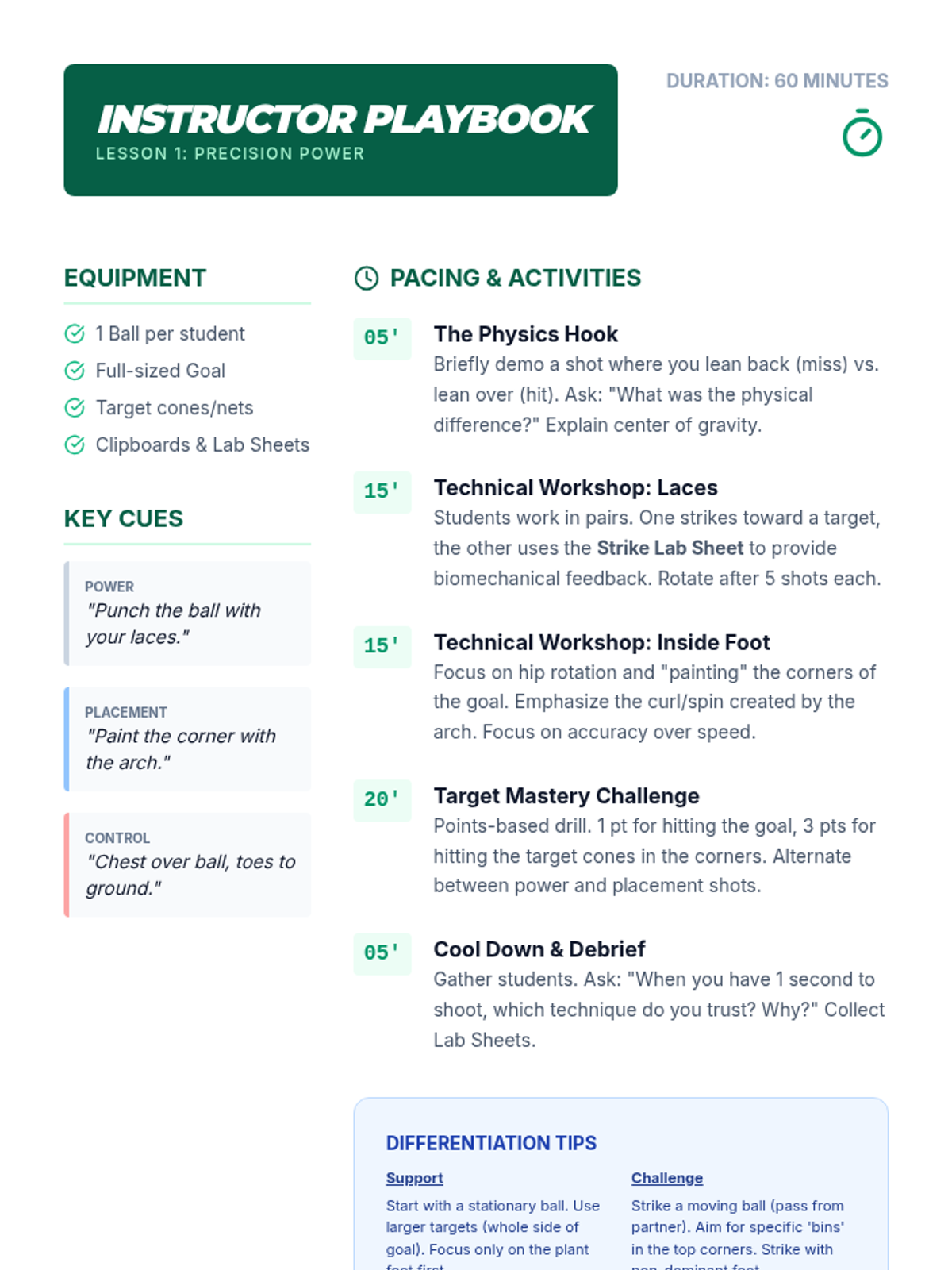 This sequence explores the biomechanics and psychology of scoring goals in football. Students will progress from foundational power striking to advanced finesse, aerial finishes, and high-pressure game simulations.
