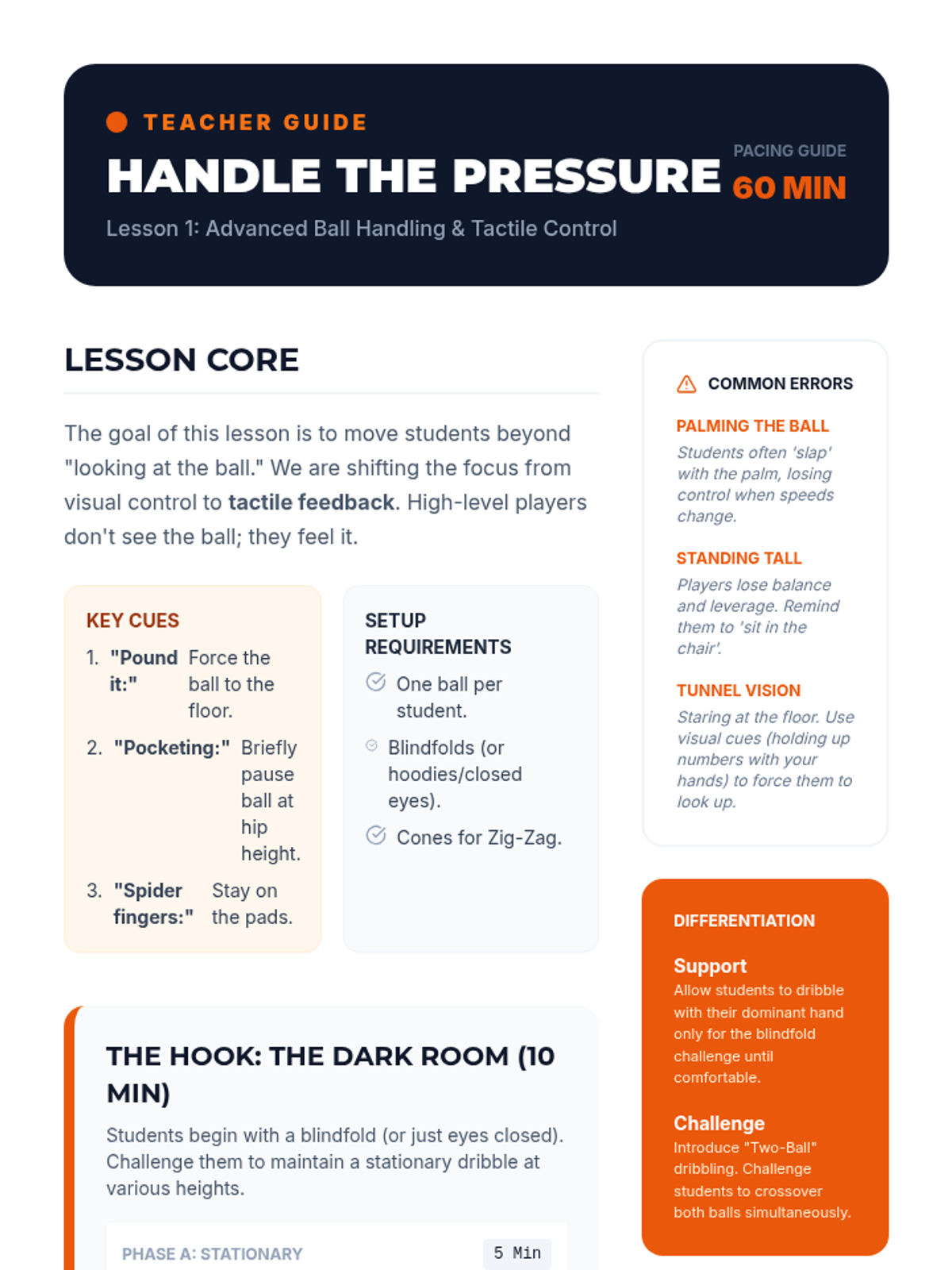 A high-intensity, workshop-style sequence for 10th-grade students to master advanced offensive basketball mechanics. Students progress from fundamental triple-threat positioning to complex finishing moves and high-pressure free throw shooting, emphasizing body control and consistency.