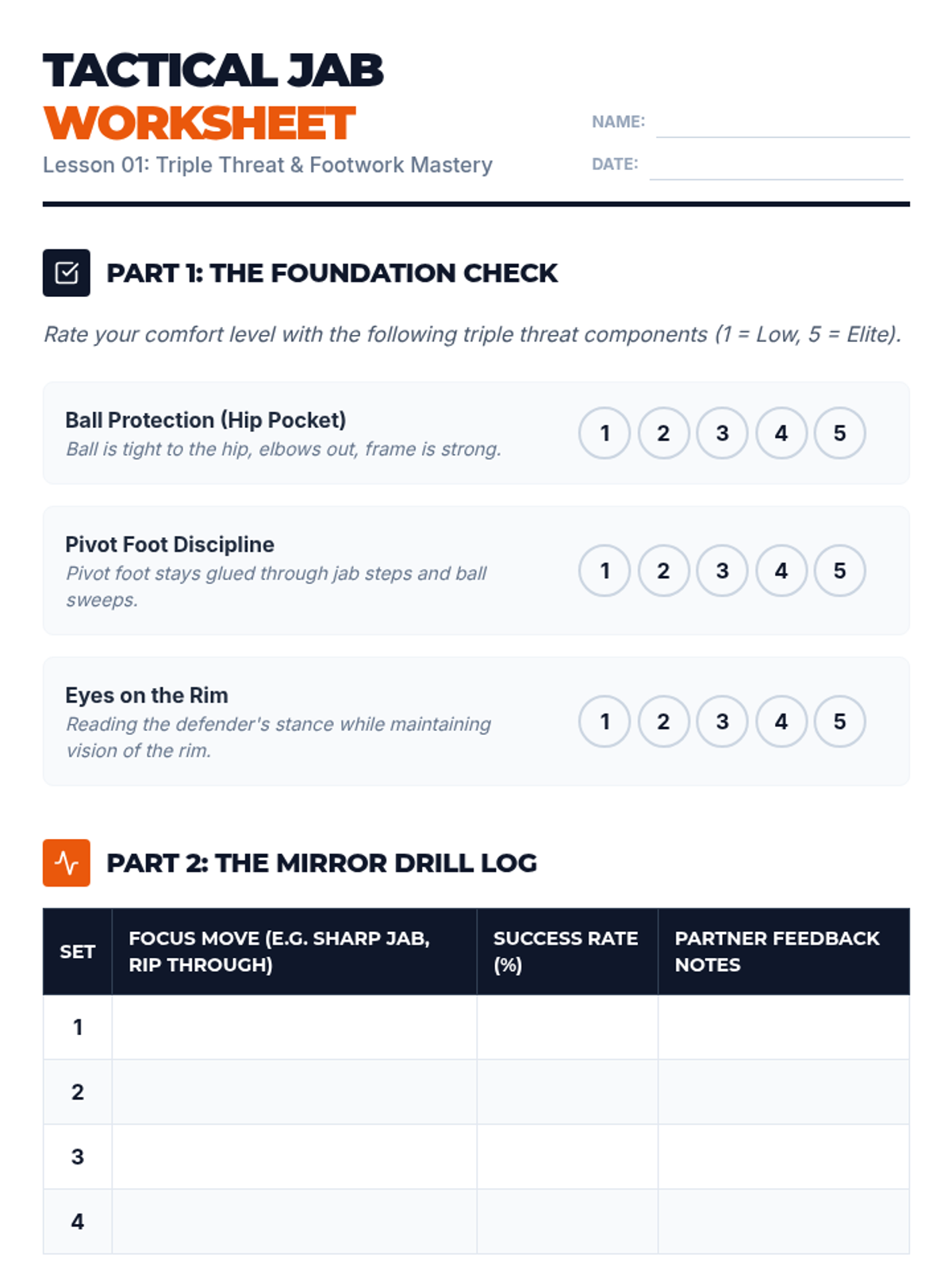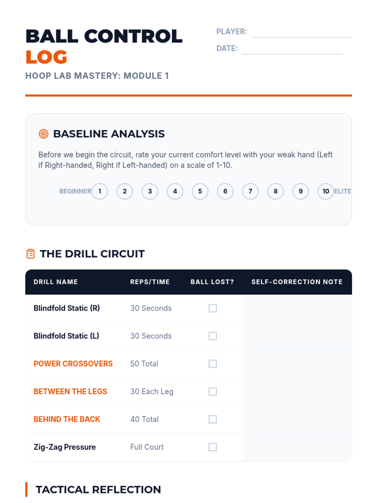 This sequence focuses on the biomechanics and technical precision required for high-level individual offensive play in basketball. Students progress from stationary ball-handling and shooting mechanics to dynamic finishing and triple-threat spacing, culminating in an integrated skills circuit.