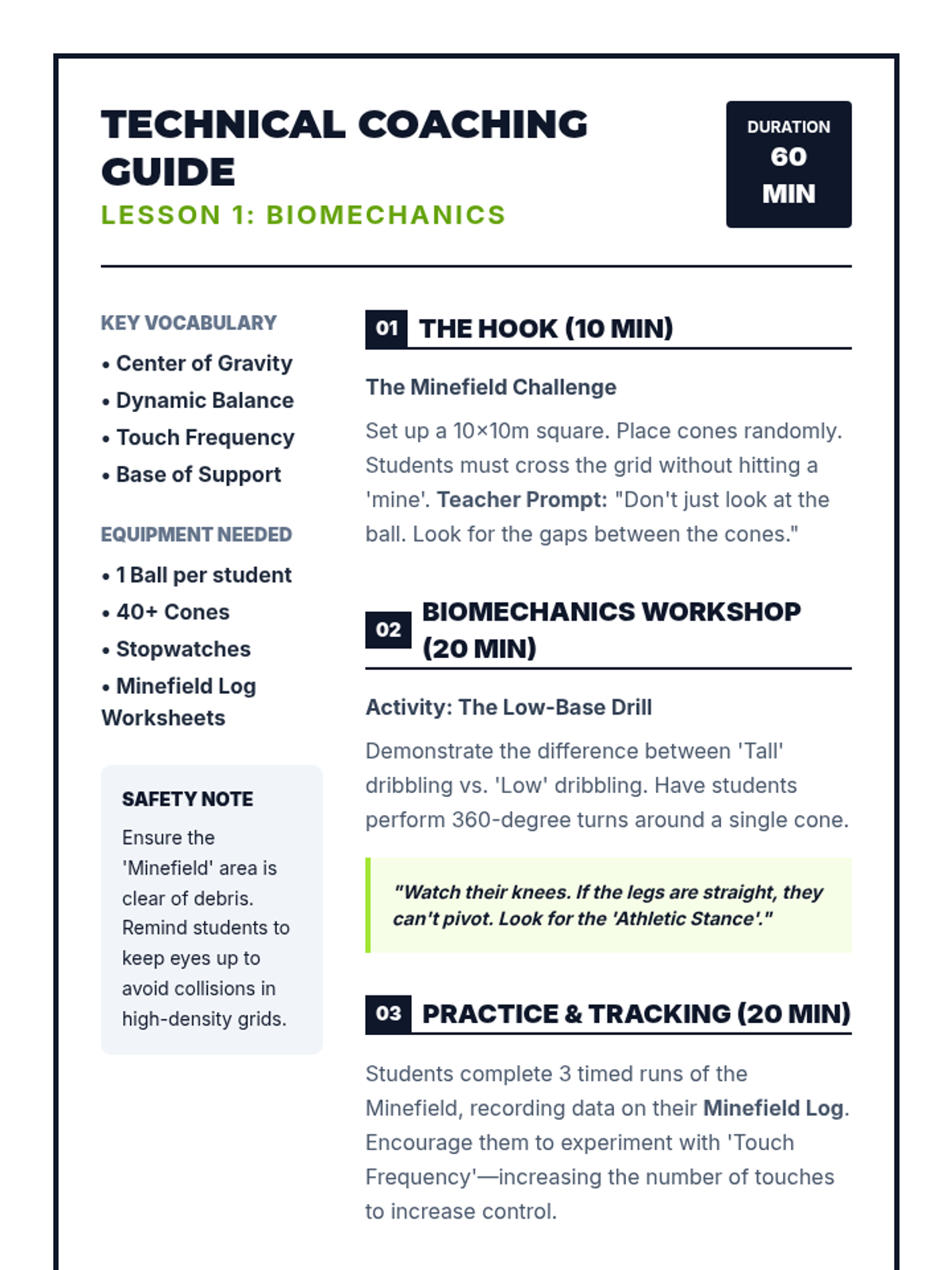 This sequence focuses on the technical foundations of football (soccer), including dribbling, passing, receiving, and tactical movement. Students progress from individual ball mastery to dynamic team-based possession drills.