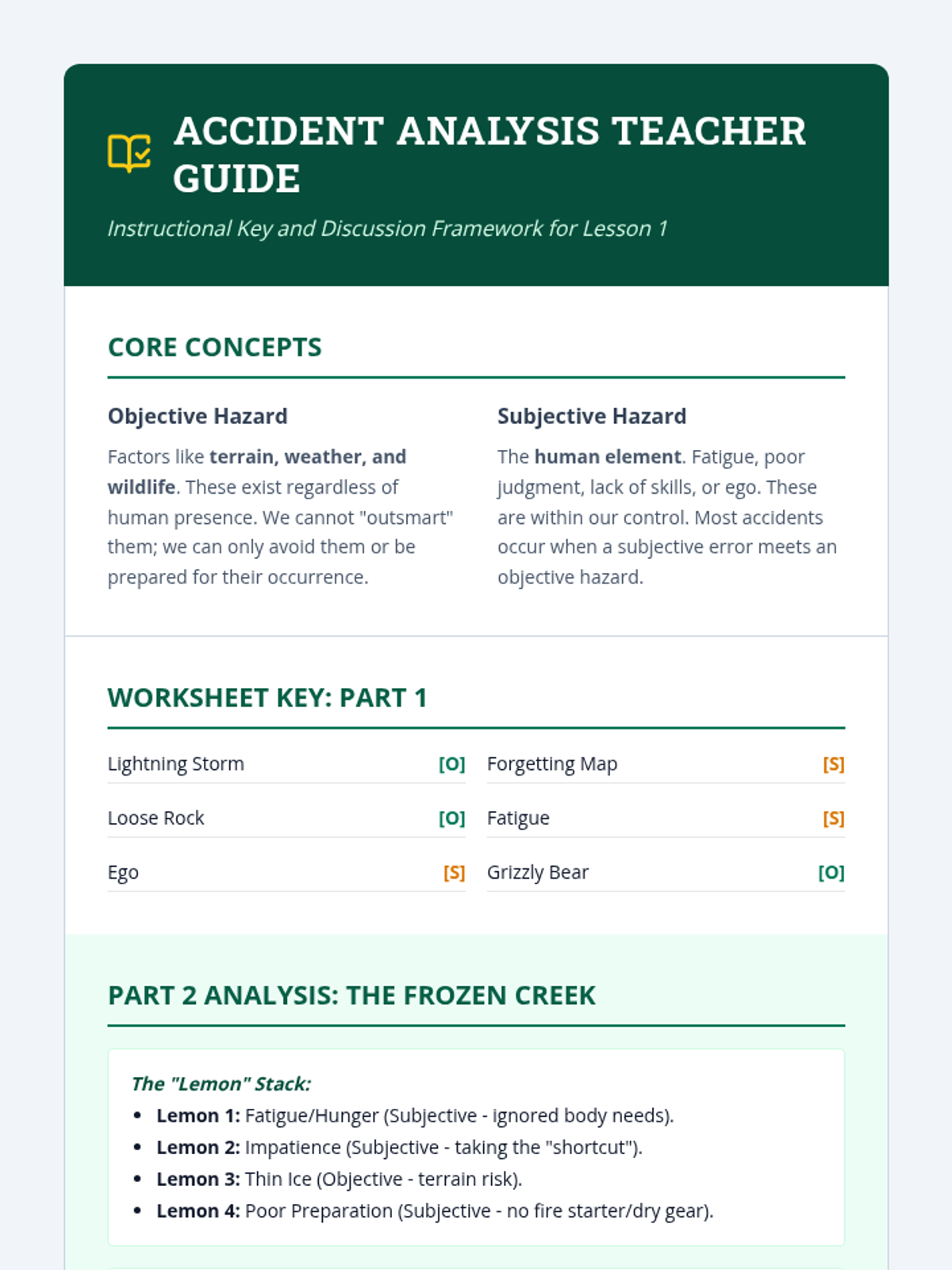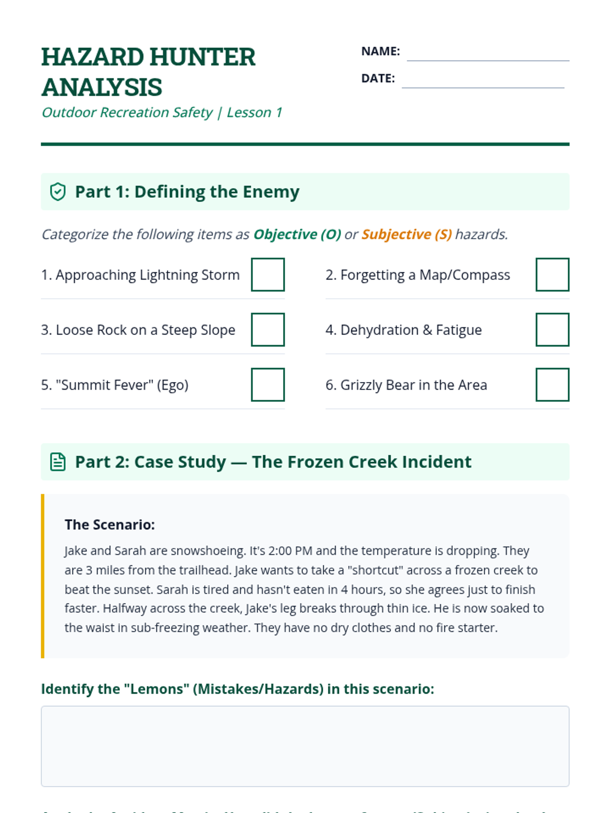 This sequence immerses students in the critical protocols necessary for safe wilderness exploration, moving beyond basic rules to complex decision-making scenarios. Students analyze hazards, weather patterns, emergency signaling, and gear maintenance to synthesize a comprehensive Risk Management Plan (RMP).