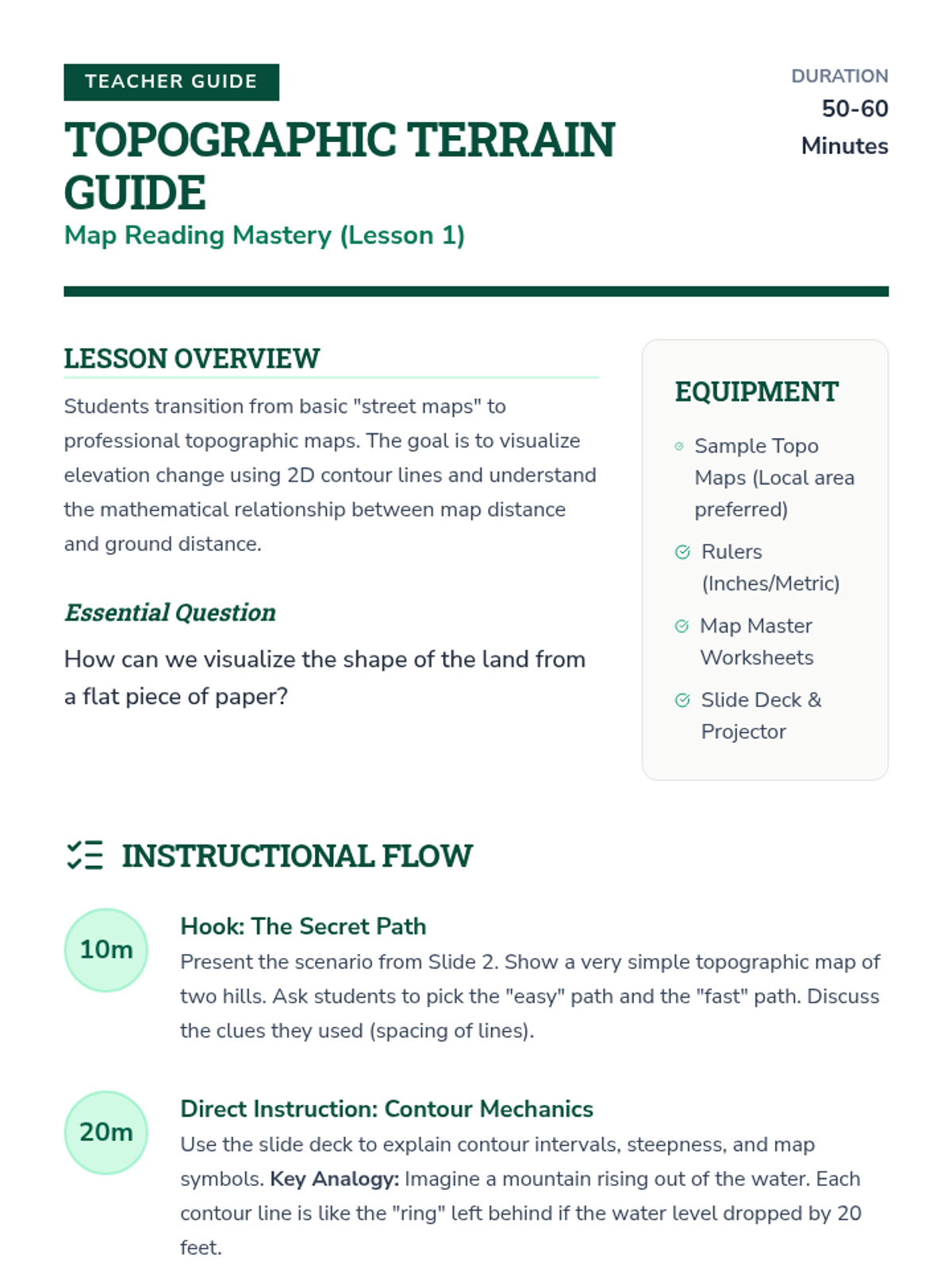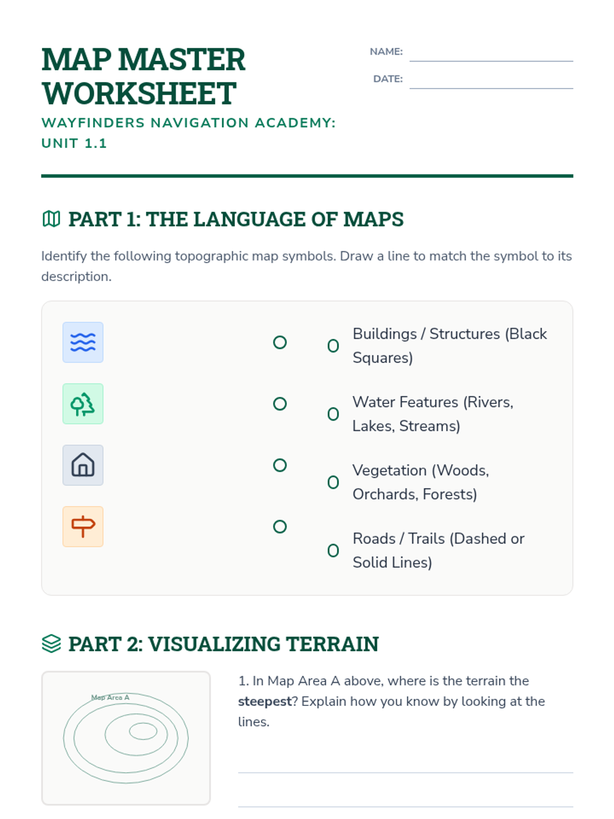 A comprehensive introduction to land navigation, teaching students how to read topographic maps, use a baseplate compass, and navigate using bearings and pacing. The unit culminates in a practical schoolyard orienteering challenge.